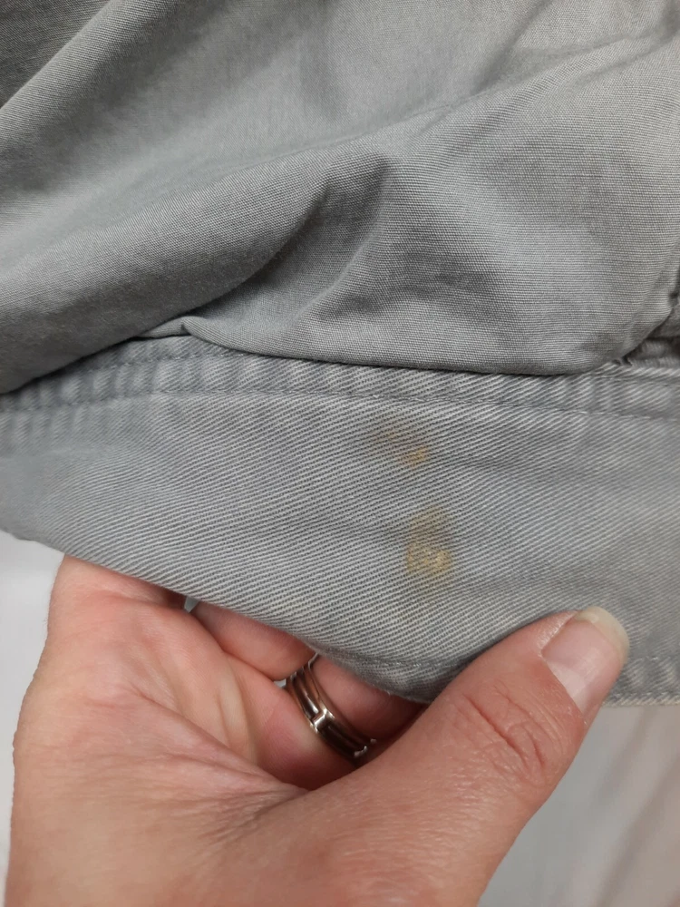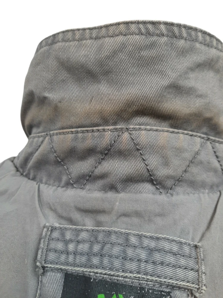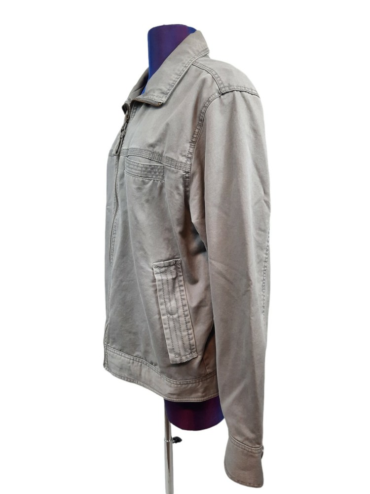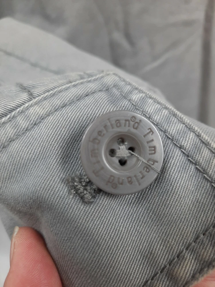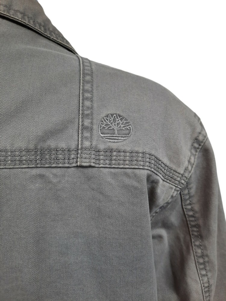 Timberland Bomber Jacket Gray Canvas Y2K Style Size Small Men's. In good condition Timberland Bomber Jacket Gray Canvas Y2K Style Size Small Men's. Features zipper closure, 1 chest pocket, 1 inside pocket with replacement button attached, 2 side pockets with snap closure, long sleeve with button cuffs, lined, heavyweight, workwear. Fabric 100% cotton Measurements laying flat chest 21" length 26" arm inseam 19" This is a pre-owned item that may show signs of wear. There are 2 stains smaller than a quarter on the base and in side of the jacket. The inside of the collar shows discoloration. Please see pictures for further details.