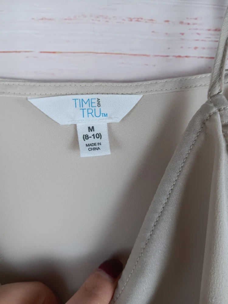 Elevate your wardrobe with this stylish Time & Tru tank top. The sleeveless top features a V-neckline and pullover closure, with adjustable spaghetti straps for a comfortable fit. The solid black color and silky fabric blend material make it perfect for any occasion, whether it's a casual day out or a night on the town. This relaxed fit tank top is designed for women and comes in a size medium. It has no vintage elements and features accents such as the strap type. The brand is Time And Tru and the type is a tank, with a cami style. It's perfect for any woman who wants to add a versatile piece to her wardrobe.