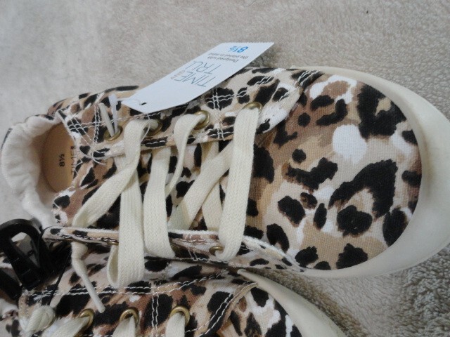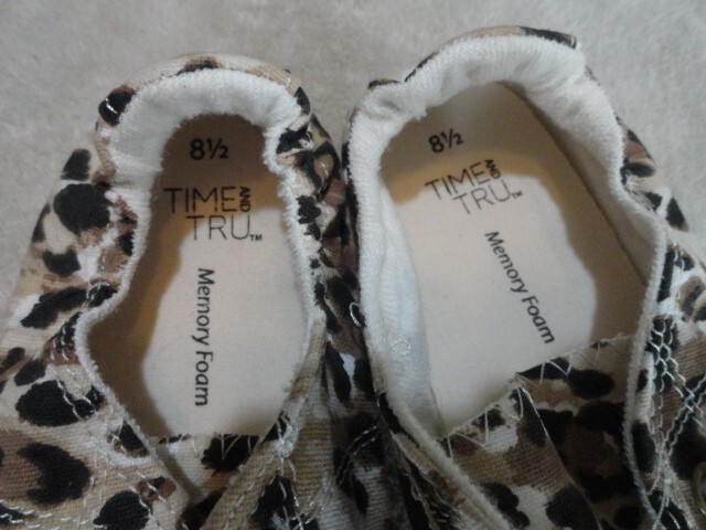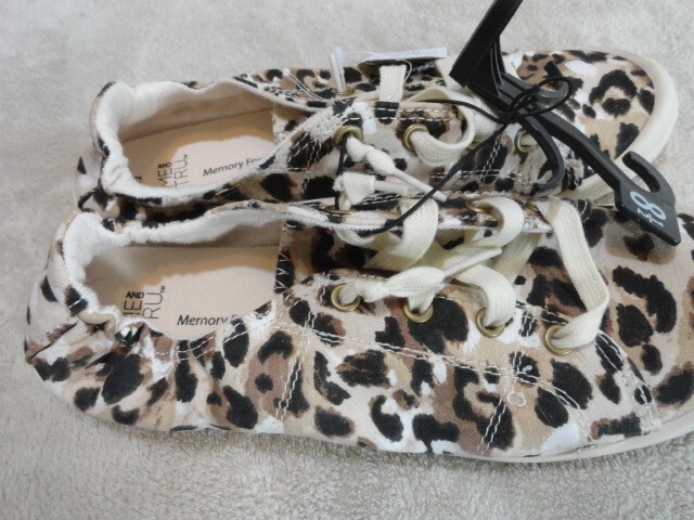 New Ladies Time and Tru Tan/BeigeBlack Leopard Print Sneakers - SZ 8.5. Scrunch back for a secure fit, memory foam cushioned insole.