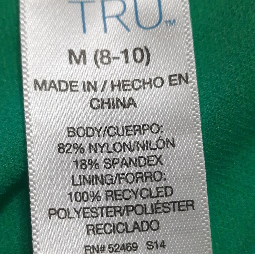 Time and Tru Multicolored Bikini Top Size Medium (8-10). NWT. The body is 82% Nylon and 18% Spandex. The lining is 100% Recycled Polyester. Machine washable and line dry. Multicolored. The bikini top ties behind the neck. Hooks behind back. Underwire. Padded with removeable pads. Soft. Stretchy. Smooth feeling. With the garment laying flat, the measurements are as follows: armpit to armpit is 13 inches, the underbust is 14 inches, and from back of the neck to bottom of the bikini bottom is 10 inches.