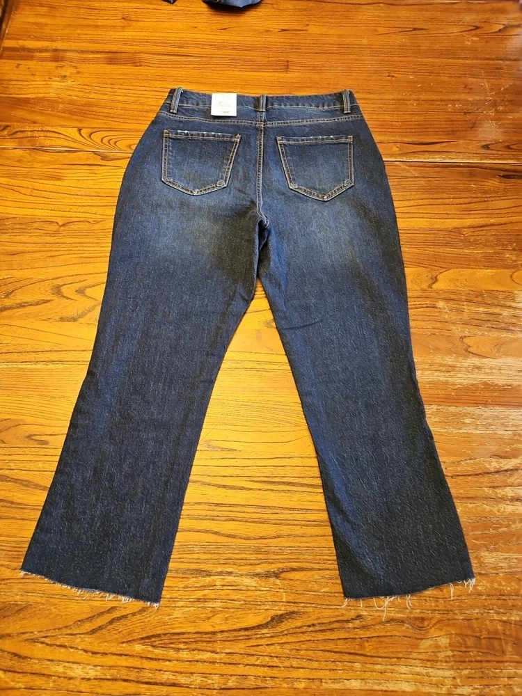 Love these jeans! The high rise is super flattering and the dark wash is versatile for any outfit. The distressed details add a cool, laid-back vibe while the stretch fabric keeps them comfy all day. The straight crop length is just right—not too short, not too long. Perfect for pairing with sneakers or boots. Washed well and held their shape after a few wears. Great quality for the price! Highly recommend for anyone who wants stylish, everyday denim.