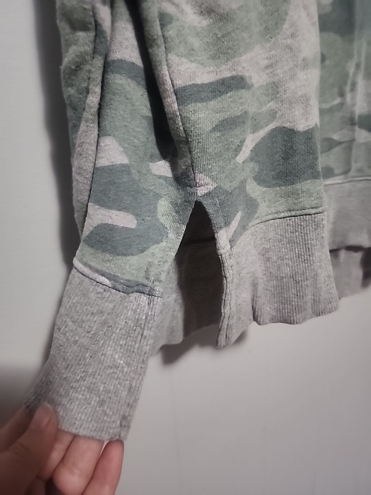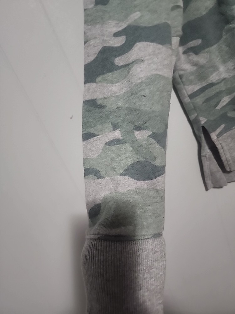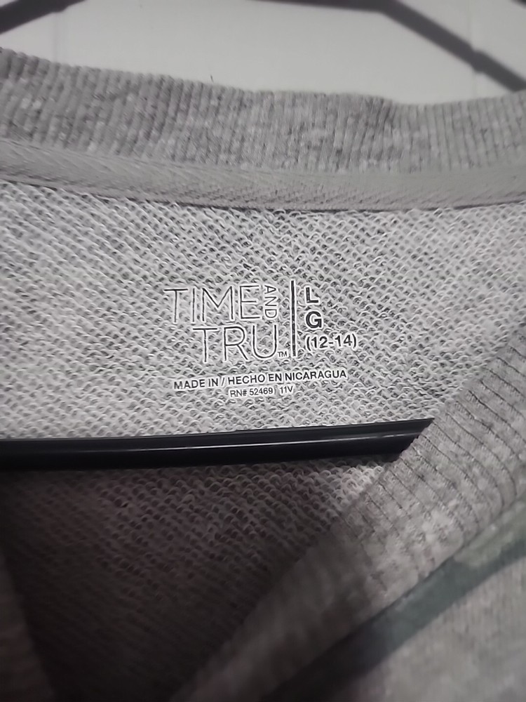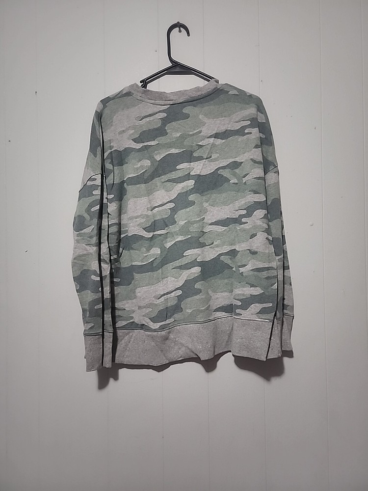 Fabric Type: Fleece Size: L Occasion: Activewear Season: Fall, Spring, Winter Lining Material: Polyester Neckline: Crew Neck Color: Multicolor Accents: N/a Size Type: Regular Brand: Time And Tru Personalize: No Sleeve Length: Long Sleeve Type: Sweatshirt Closure: Pullover Fit: Relaxed Garment Care: Machine Washable Character Family: N/a Department: Women Pattern: Camouflage Character: n/a Product Line: Time and Tru Vintage: No Material: 80% Cotton 20% Polyester Theme: Military & Weaponry Country/Region of Manufacture: Nicaragua Performance/Activity: Yoga, Wrestling, Weightlifting, Walking, Running & Jogging, Military, Hunting, Hiking, Gym & Training, Cross Training, CrossFit, Cheerleading, Bodybuilding, Beach Features: All Seasons, Lightweight Style: Pullover Chest Size: 22 in