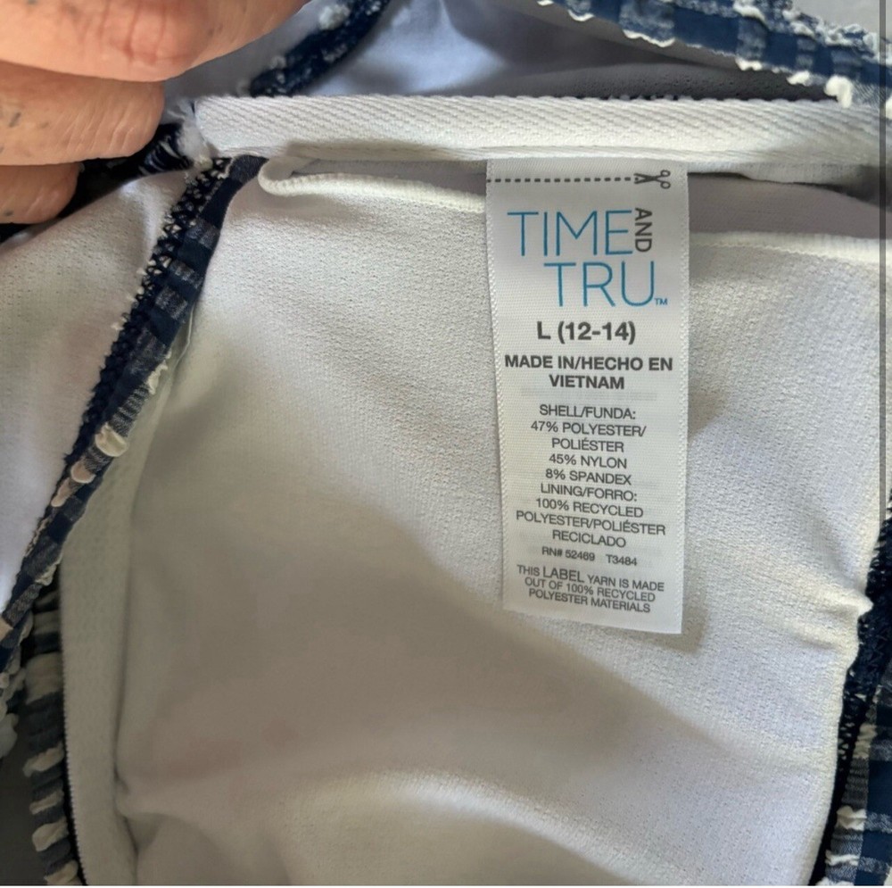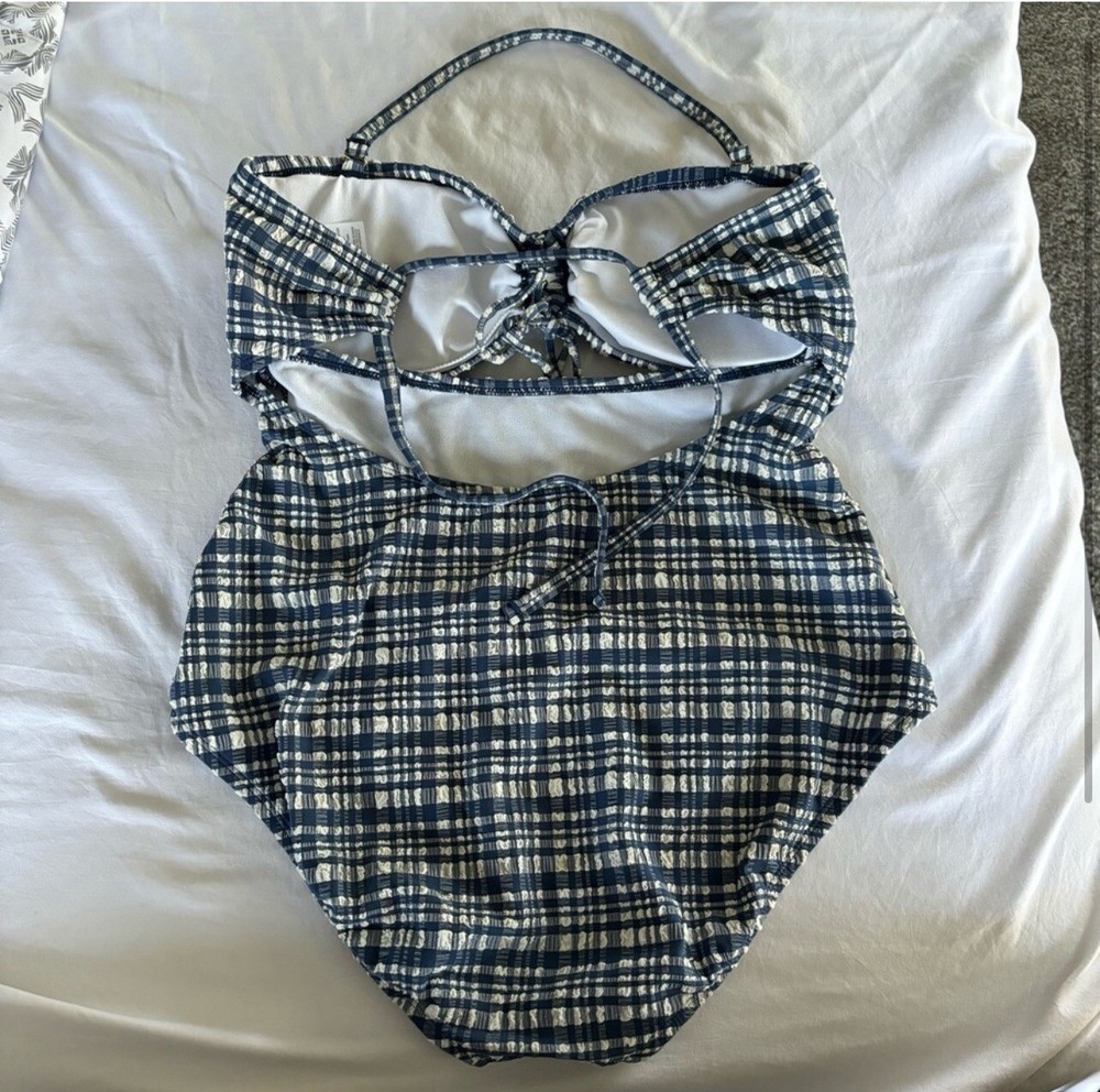 Has stretch and padding with an adjustable and removable halter neck strap. Ties in the back . Blue and white . All final sale Beach vacation Hawaii cruise resort swimming pool cutesy rockstar rockabilly Pin Up retro 50s vibes