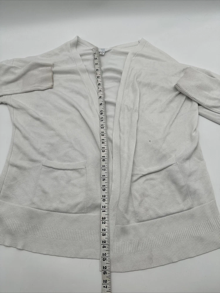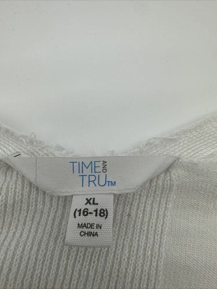 This Time and Tru cardigan for women in size XL is a classic piece for any casual occasion. The white solid pattern is elegant and versatile, while the long sleeves and open style make it comfortable and easy to wear. Made of polyester and rayon, the material is lightweight and soft, ensuring a pleasant fit. The cardigan is designed with a regular fit and size type, perfect for any women's department. The brand, Time & True, is known for its quality and style, making this sweater a great addition to any wardrobe. The sweater is manufactured in China and features an open style, making it perfect for layering over any outfit. *Check the images above for the flaws and measurements of the item.