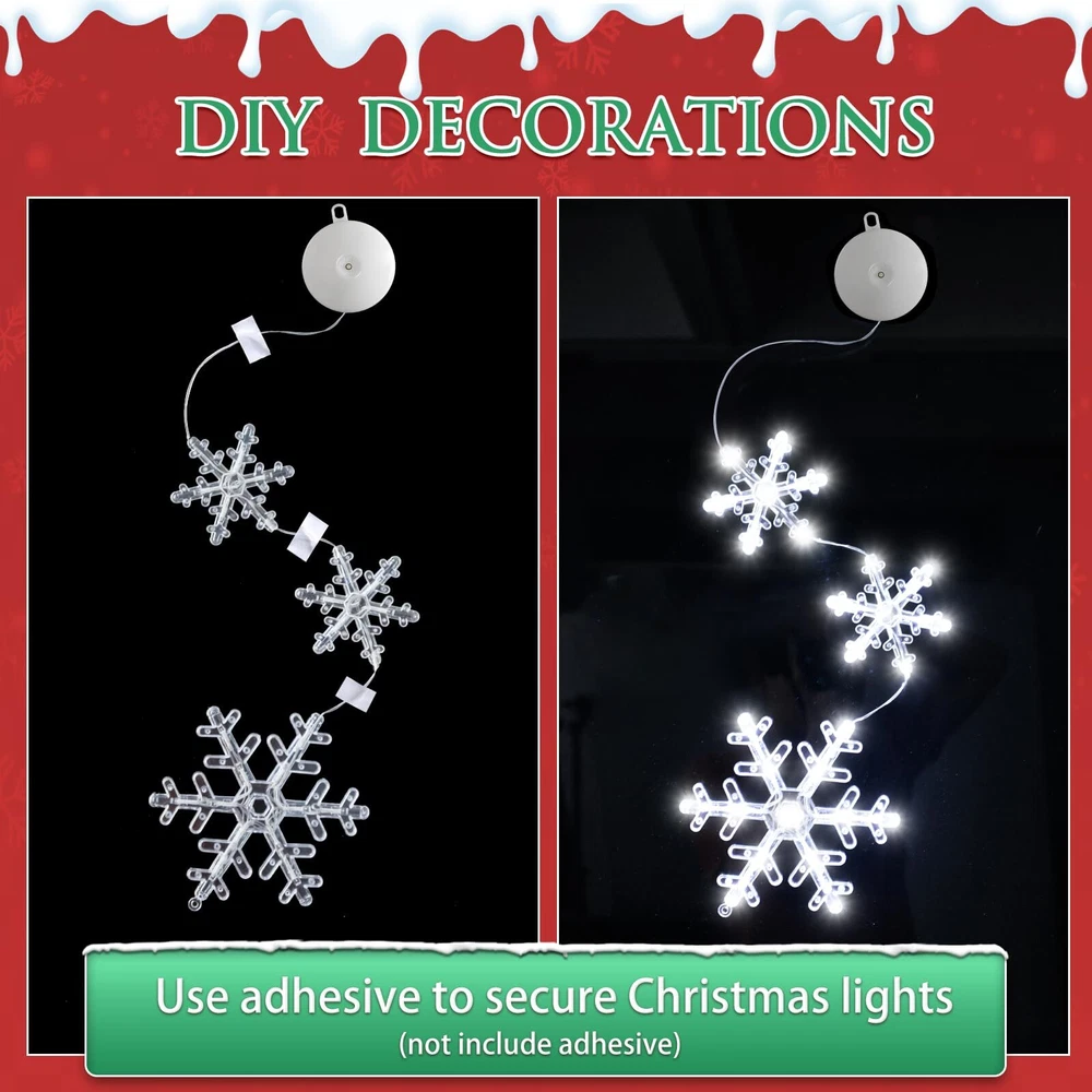 đăCHRISTMAS WINDOW LIGHTSă:The snowflake shaped Xmas window lights with suction cup, total 72 white LED bulbs, no harm to wall, You can place the lighted Christmas window lights ornaments wherever you want to brighten your Christmas night for your family. âď¸ăTIMER FUNCTIONă The timer function that automatically cycles on for 6 hours and off for 18 hours saves energy, and you don't have to set it up every day. The built-in timer function will automatically activate when you turn on the light. đăEASY TO USEă : the window decoration light comes with a suction cup, which can be easily installed on glass, gates, cabinets, etc., and the height can be adjusted according to the fixed position and press the ON/OFF button on the battery compartment to turn on/off the lights (Lighting Mode: Steady on, Twinkling).make sure that the suction cup is clean before installation, adding appropriate water to increase the adhesion. đăEASY TO USEă : the window decoration light comes with a suction cup, which can be easily installed on glass, gates, cabinets, etc., and the height can be adjusted according to the fixed position and press the ON/OFF button on the battery compartment to turn on/off the lights (Lighting Mode: Steady on, Twinkling).make sure that the suction cup is clean before installation, adding appropriate water to increase the adhesion. đ ăWIDE APPLICATIONSă: Christmas string lights decoration with hooks can be hung on door, porch, hallway, balcony, roof edge, bedroom, mantel, hearth, centerpiece, Christmas tree, garland, garland, railing, handrail, hallway, deck, patio, bar, Bistro, Cafe, Bar, Restaurant, Shopping Mall, Office, Private Car. âăGIFT LIGHTSă: With the Classic Christmas shaped lights, no extra bore and doubt on gift choosing, these reusable festival decor lights will be the first choice as the best wishes for family, friends, relatives or colleagues.