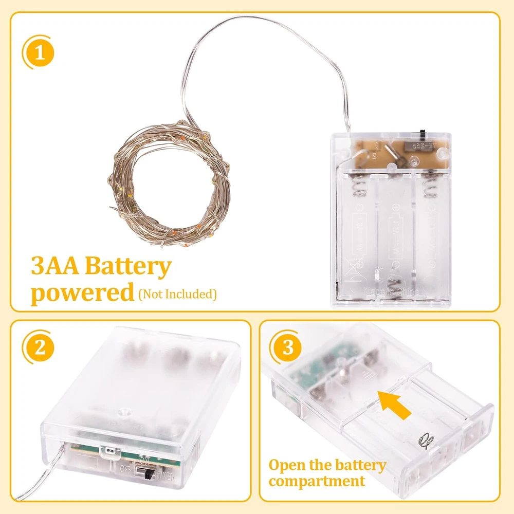 Store New Arrivals Add to Favorite View Feedback Contact Fast deliveries to the customer's home Quality customer service John Make the customers happy! Timer Led String Lights,1 Pack Battery Powered Starry Fairy Mini Light,Battery Operated Micro Lights for Bedroom,Christmas,Parties,Wedding,Centerpiece,Decoration (5M/16Ft Warm White) Description Warm white micro leds are super bright, creating warm atmosphere. The led bulbs create a 360° sparkling glowing. The effect is much better than incandescent lights The bulbs are built on ultra slim thin silver wire. 4'' Distance Between LED Bulbs. Battery case dimension: 2" x 2-3/4" x 3/4". Operated by 3 AA Batteries (Not Included) Timer/Steady On/off: The switch has three positions, off to the left, on to the right. Push the switch to the middle you can active the timer function for 6 hours on and 18th hours off. Batteries last around 48 Hours when you use them 24/7 without stopping. These string lights are excellent decoration for Christmas, holiday, celebrations, weddings, Halloween, Christmas, Valentine's, Mardi Gras, custom parties, creating fairy effects The light string is waterproof, but the battery case is not waterproof. If you order these lights for outdoor use, please wrapping the battery compartments up in plastic bags or waterproof box Product Description Timer Battery Operated Fairy Lights Fairy lights are like many stars flashing when you put the fairy lights in the glass jar. Creating warm and comfortable, harmonious and romantic atmosphere for your home. Timer Battery Operated Mini Lights With its waterproof, weatherproof and windproof feature, Easy to use and extremely bright and provides a warmth, comfortable and relaxing atmosphere. Ease Shaping ,Flexible Silver Wire The Fairy Lights are made with a high quality silver-colored copper wire that is thick and flexible. The string lighting can be easily bended and shaped around plants, signs, furniture and almost everything else! Safe and Energy Efficient: LED Fairy lights is low energy consumption. No overheat, safe to touch. No glare, the soft warm lights in order to protect your eyes. LED String lights composed of high Bright Warm White Micro LEDs, 360 degrees viewing angle,giving a light fairy effect. The Fairy Lights are made with a high quality silver-colored copper wire that is thick and flexible. The string lighting can be easily bended and shaped around plants, signs, furniture and almost everything else! The wire string is IP55 waterproof, can even be immersed in water. (The battery case is not waterproof.) Item model number ['3AA'] Light Source Type LED Style Modern Number of Items 1 Power Source Battery Powered Number of Light Sources 50 Control Method Remote Theme Wedding Batteries Included? No Controller Type push Batteries Required? Yes Material Plastic Seasons autumn, winter Number of Batteries 3 AA batteries required. Package Dimensions 3.31 x 3.19 x 0.75 inches Included Components 2 sets of 16 feet LED string lights, 2 battery boxes Item Package Quantity 1 Indoor/Outdoor Usage Indoor Light Color Warm White Water Resistance Level Waterproof Item Weight 0.352 ounces Specific Uses Indoor use only Occasion Wedding, Christmas, Mardi Gras, Halloween Special Features Timer Special Feature Timer Color Warm White Wattage 3 watts Batteries 3 AA batteries required. Voltage 4.5 Volts ABOUT US We offer the best prices around on high quality products. Our E-store includes media such as books, movies, music and games while offering electronics, toys, sporting apparel, clothing, tools, general home, garden items and more. SHIPPING We are always working hard to ensure your package arrives as soon as possible. Please understand that some factors like weather, high postal traffic, and the performance of shipping companies are outside of our control. We offer free shipping to the lower 48 states and ship within 2 business days of payment, usually sooner. We do not accept P.O. Boxes. Please provide a physical address. For shipping outside of the continental USA, we only use eBay's Global Shipping Program. The item is shipped to KY and then sent to the rest of the world. International customers are responsible for all duties and taxes. Continue to 'check out' to calculate costs for shipping the item to your country. Messages regarding eBay's Global Shipping Program MUST be directed at eBay EXCLUSIVELY. RETURNS We offer a 30-Day Return Policy on items in which you are not completely satisfied with. You have the option of a full-refund or an exchange of the item. No returns are available on items shipped outside of the USA PAYMENT We accept PayPal. CONTACT US This page content is yet to come Please ad us to your favorite seller and visit again later Thank You CUSTOMER SATISFACTION We try our very best to make sure every customer is completely satisfied. If there's a problem, message us! We're happy to help. WE ACCEPT