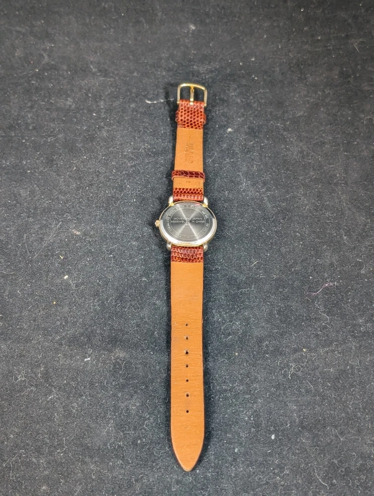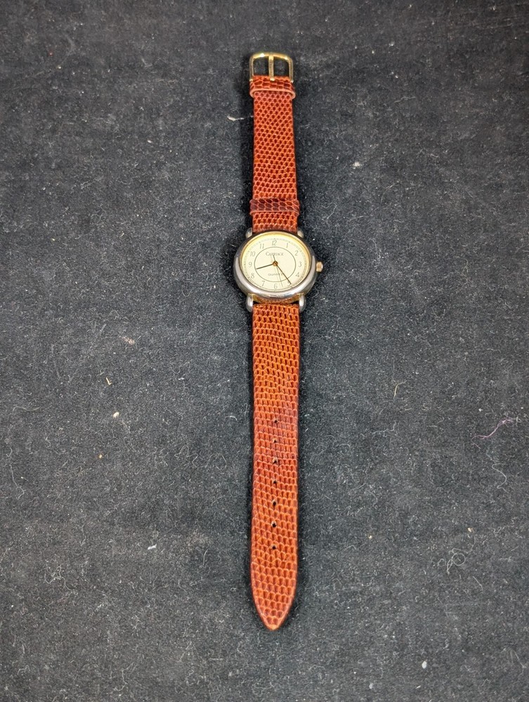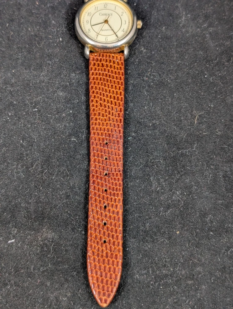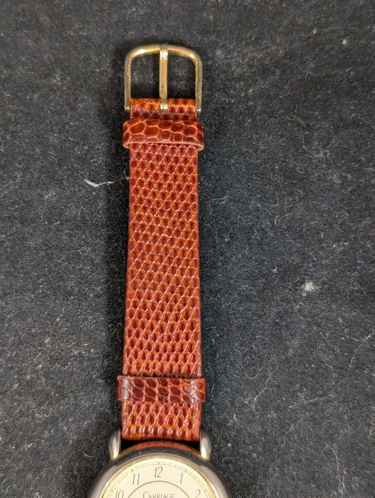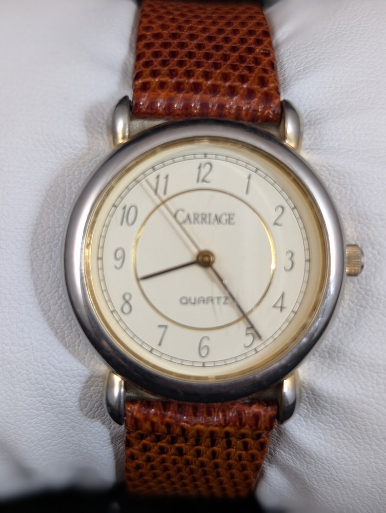 This Timex Carriage wristwatch features a brown leather strap and a gold-plated case, with a white dial and Arabic numeral indices. It is powered by a quartz movement and has a water resistance of 30 meters (3 ATM). The watch also features a second sweep hand and a 12-hour dial, making it a practical and stylish accessory for any unisex adult. The watch comes with a brown leather strap and a gold-plated case, with a white dial and Arabic numeral indices. It is powered by a quartz movement and has a water resistance of 30 meters (3 ATM). The watch is perfect for casual wear and is not customized or papers. It is manufactured by Timex and has a model name of Timex Carriage.