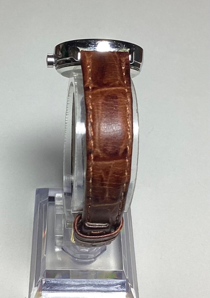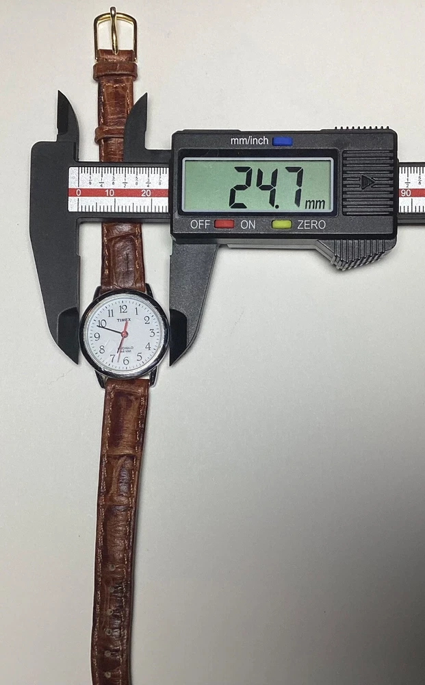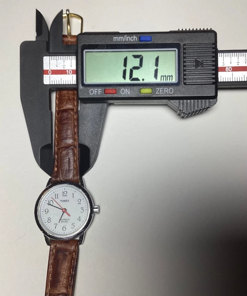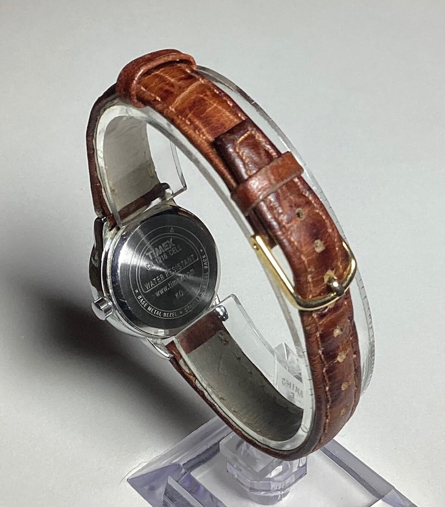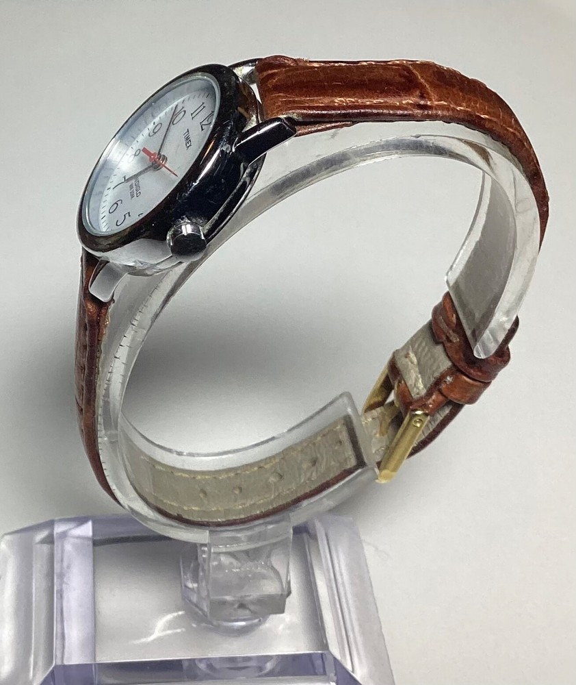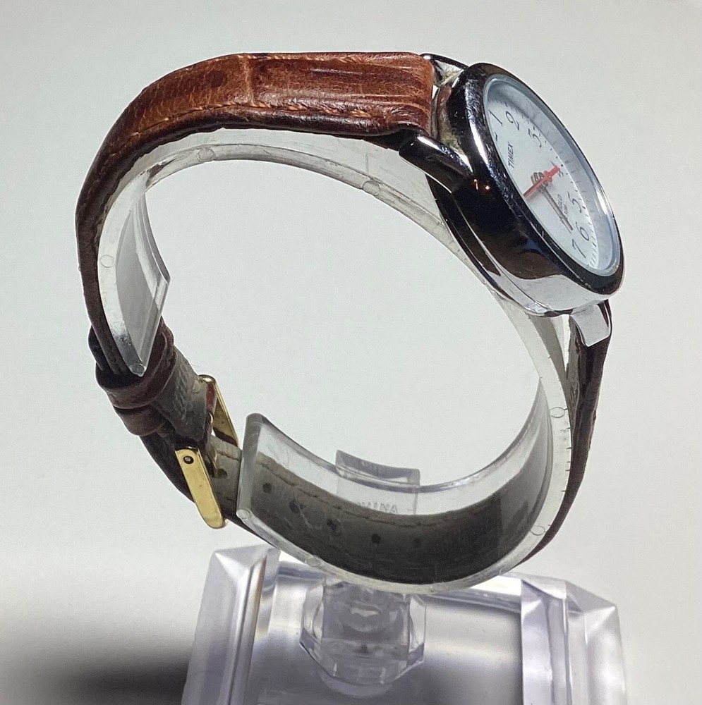 This Timex Indiglo women's vintage watch is a stunning addition to any collection. With a round silver case and a two-piece brown leather strap, this watch exudes both dressy and casual vibes. The white dial features Arabic numerals and a backlight function, making it easy to read in any lighting. This wristwatch is water-resistant and comes with a quartz movement, ensuring both accuracy and durability. The snap caseback and buckle closure make it easy to put on and take off, while the 12-hour dial and central second hand add extra functionality. This Timex Indiglo watch does not come with papers, service records, or original packaging, but it is sure to impress any watch enthusiast. 1237