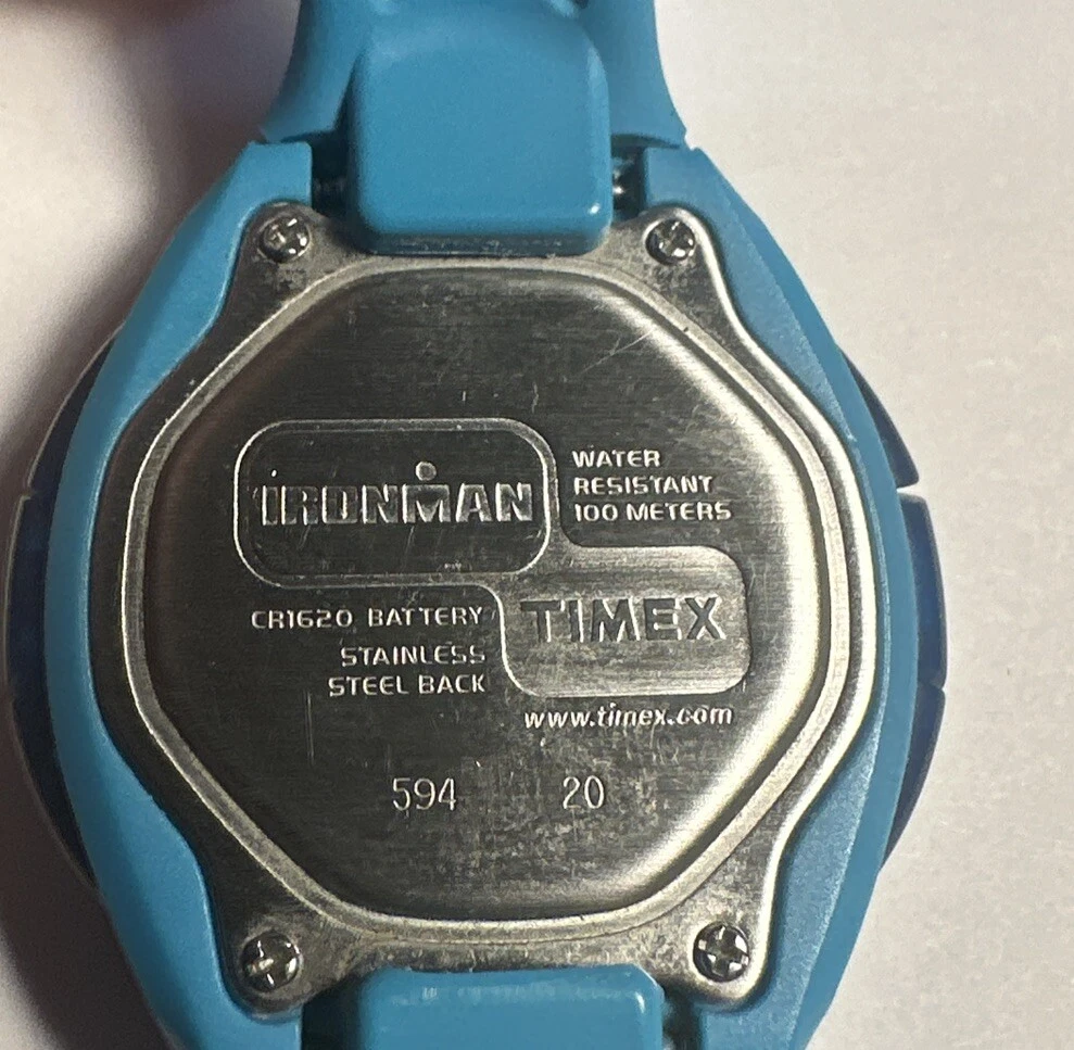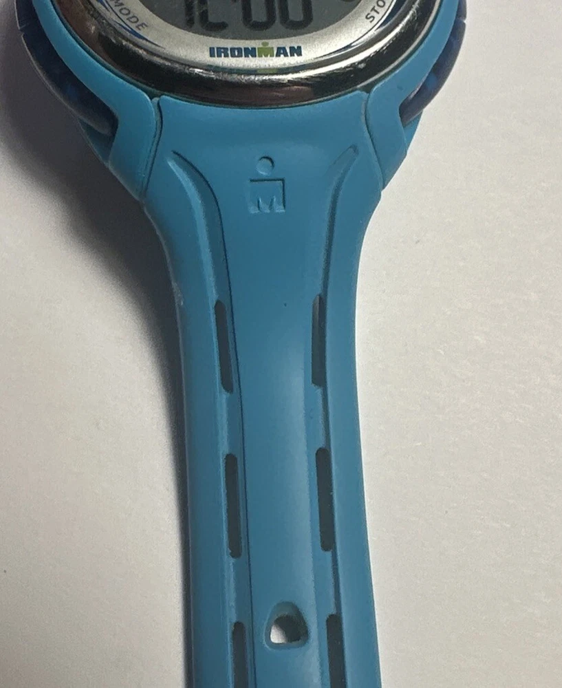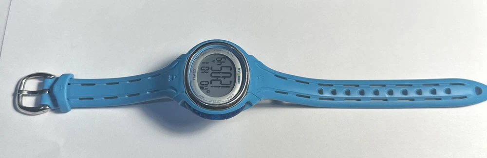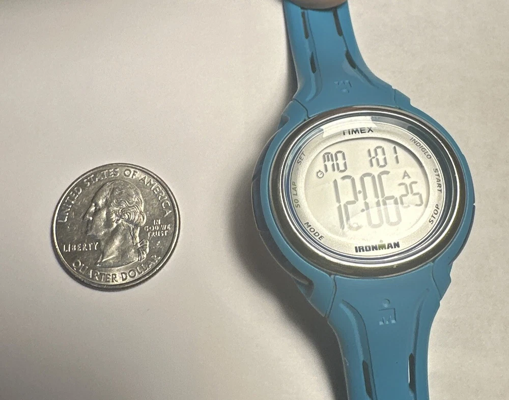 This Timex Ironman Light Blue Silicone 50 Lap Indiglo Watch is perfect for women who love sporty styles. With a 38mm rubber case and a two-piece silicone and rubber strap, this wristwatch is both durable and comfortable to wear. It features a digital display with Arabic numeral indices, a month indicator, a date indicator, and a day indicator. The watch is powered by a quartz movement and has a screwback caseback. The bezel color is blue, and the dial color is silver. This watch is suitable for wrist sizes between 7.26-7.5 inches and has a band width of 12mm. New Battery