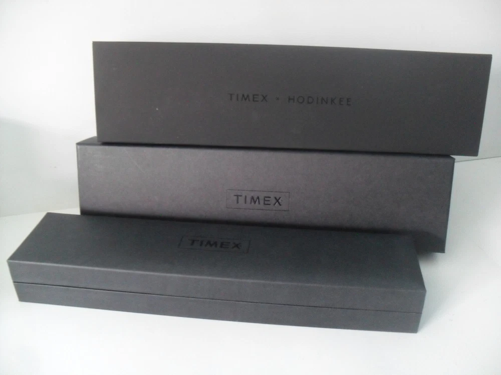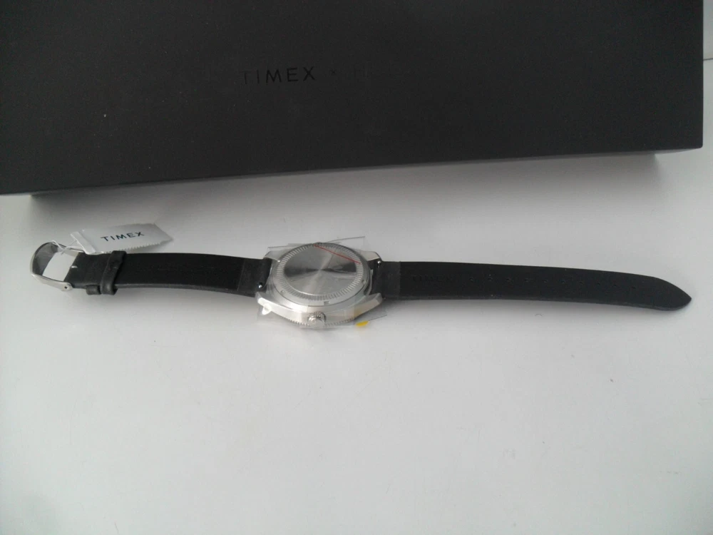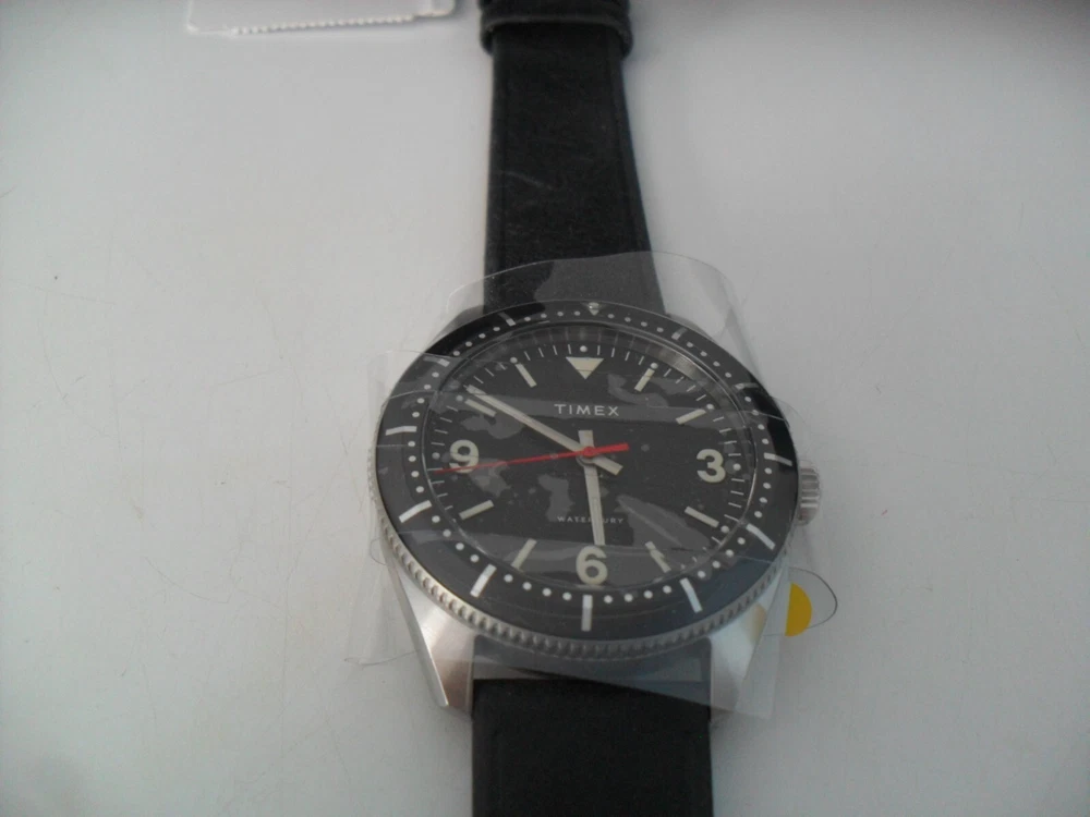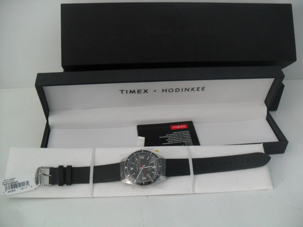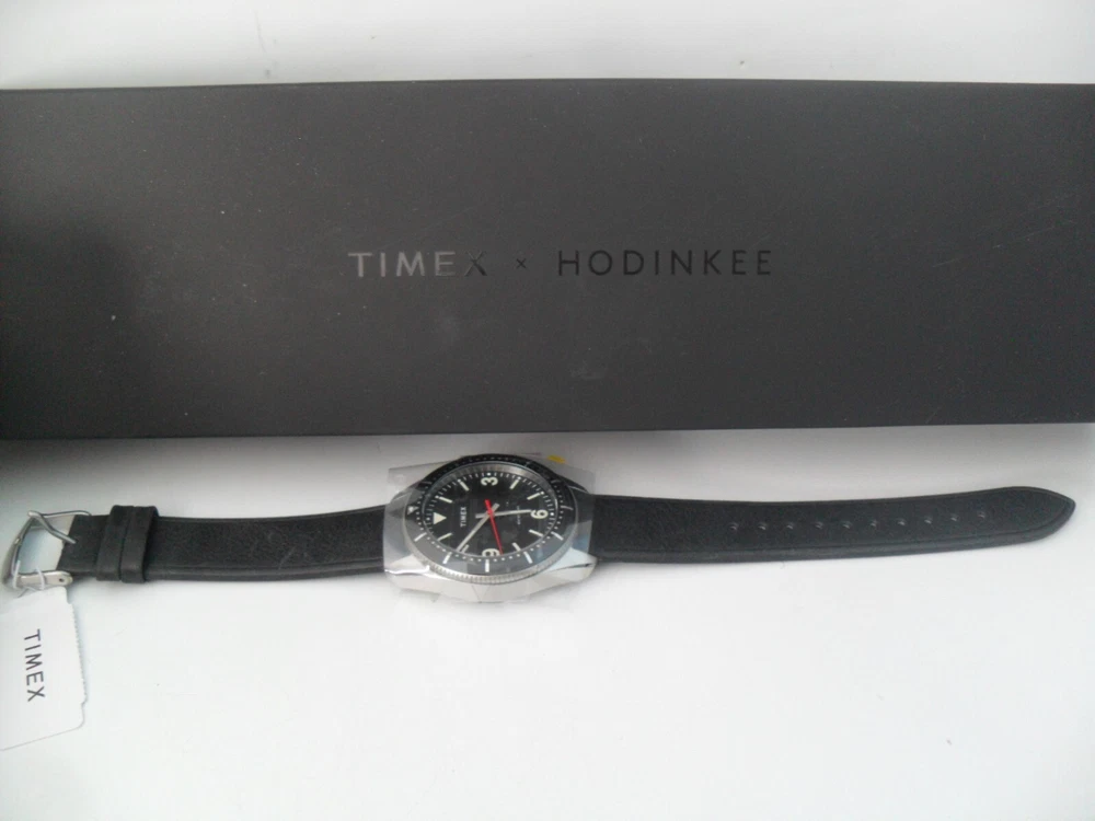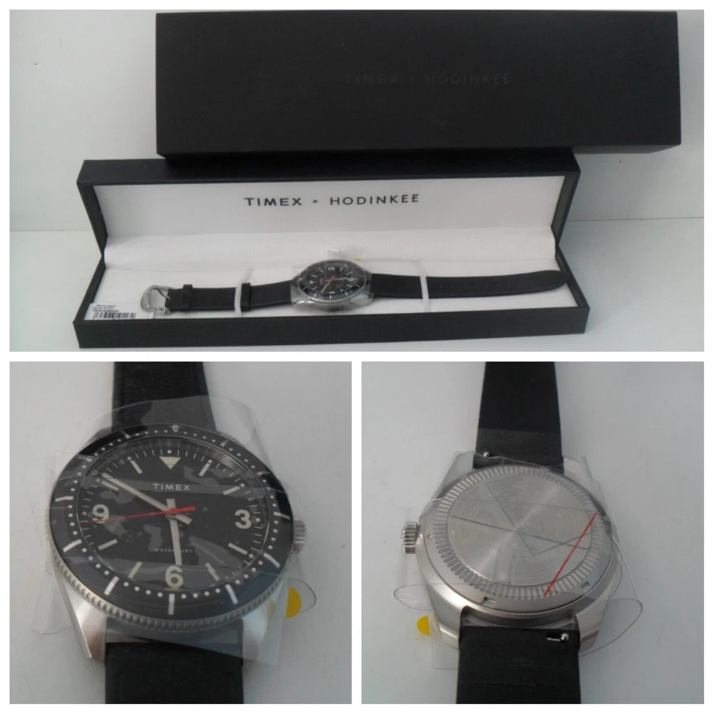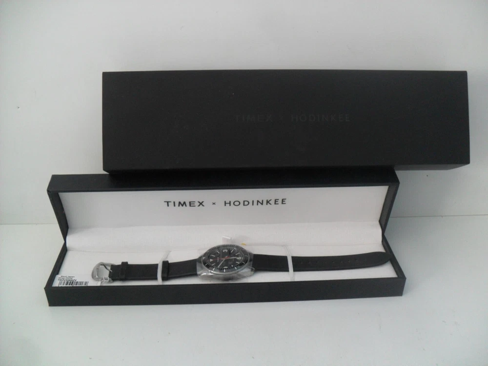 This is a Limited Edition HODINKEE X Timex Waterbury Automatic Watch - 42 Hour Power Reserve Automatic Movement! Brand New - Never Worn! This is a Rare Collaboration Model between HODINKEE and Timex that hit it right on! A throwback to the Timex Roots as they began as the Waterbury Clock Company in 1854 - This is an Automatic Movement 42 hour Power Reserve Classic Waterbury Model. See Below for Details and Specs of this Limited Edition Collaboration. It all starts with the 40mm × 13mm brand-new Waterbury dive case profile, with simple, downward-facing lugs; a three o'clock push-pull crown stamped with the stylized vintage Waterbury Clock Company logo; and a closed screw-down caseback we left blank in the hopes that you’ll engrave it with a special message for a special someone. The fully graduated aluminum bezel insert features easy-to-grip knurling on its side and a luminous pip at the zero marker. One of our favorite details is the clean bevel on the bezel insert that inclines downward and out. Inside the black dial offers a hint of rakish, devil-may-care charm with its beautiful black textured finish; it features a printed Timex logo underneath 12 o'clock and printed hour markers filled with Super-LumiNova™, and a very clean look as there is no date window. Rounded Arabic numerals at three, six, and nine o'clock, recall vintage tool watch designs. The entire look is symmetrical, clean and easy on the eyes. The newly designed hour and minute hands are executed in the shape of lume-filled batons, while the central seconds hand is drenched in a bold red hue. The HODINKEE signature Logo above six o'clock is colored a matching shade of black to match the rest of the dial. Think of it as our own secret signature. For all the purists out there, we’ll make this clear upfront: despite what the unidirectional elapsed timekeeping bezel might want to tell you, the Timex Waterbury HODINKEE Limited Edition is not an ISO-certified dive watch. It’s only tested to 100 meters of water resistance and the crown opens up with a push and a pull rather than screwing down for security. But for everything else? It’s a proud desk diver that is more than up for the challenge. Jump off a diving board with it on your wrist. Sit back and relax with a cold one in your hand. SPECS: Function: Hours, minutes, seconds Material: Stainless steel Bezel: Aluminum Dimensions: 40mm diameter; 13mm thickness; 47.5mm lug to lug Caseback: Stainless steel Dial: Black textured dial Lume: Yes, Super-Luminova Caliber: Automatic Miyota 8215 Power Reserve: 42 hours Water Resistance: 100 meters Bracelet/Strap: Black Calf Leather Lug Width: 20mm