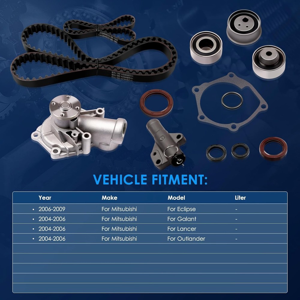 TCKWP332 TB332-168K1 CPW6622 Timing Belt Water Pump Kit 2006-2009 for Mitsubishi Eclipse 2004-2006 for Mitsubishi Galant 2004-2006 for Mitsubishi Lancer 2004-2006 for Mitsubishi Outlander Compatible with Mitsubishi Eclipse (2006-2009), Galant (2004-2006), Lancer (2004-2006), and Outlander (2004-2006). Drives the engine's air distribution structure for optimal cylinder operation. Reduces noise and ensures smooth engine performance and acceleration. Made from high-performance materials to minimize deformation and extend lifespan. Check part number and fitment chart before ordering for compatibility. Top Seller | Fast, Reliable Shipping | Always Free | 1-Day Processing | Customer Support You Can Trust Questions? We’re Happy to Help We’re committed to giving you a five-star experience from start to finish. Whether you’re just browsing or have already made a purchase, we’re available to answer your questions quickly and clearly. All communication is handled through eBay’s messaging platform. We usually respond within 24 hours. Buy with Confidence Each item is carefully inspected before shipping to ensure it arrives as described. Orders ship within 1 business day using USPS or UPS. Shipping is always free. ♦ Due to lighting and screen differences, actual color may vary slightly. 🇺🇸 Ship from USA 🚚 Free & Fast Shipping 🛒 30 Days Return PLEASE VISIT OUR STORE TO CHECK OTHER ITEMS! Thank you for shopping at our store.