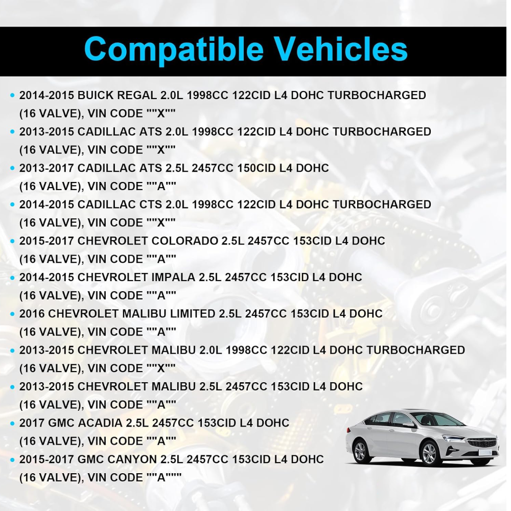 WHY OUR CUSTOMERS KEEP SHOPNG WITH US ✅All items are covered by manufacturer warranty. ✅FAST FREE SHIPPING. ✅Most orders ship within 1 business day with Tracking Number. Customer also can choose two-day or expedited shipping. ✅100% customer satisfaction is backed by a 30-Day Money Back Guarantee for New items and a 30-Day Money Back Guarantee for Recon. FEATURES 1 Manufactured with Precision to Meet OE Standards IATF16949 Certified. 2 High Quality & Brand New 3 Two Year Warranty. 4 After Market Replacement 5 Customers Service Center Will Deal with Pre-sale and After-sale Problems In Time Timing Chain Kit with VVT Gears for 13-17 Buick Cadillac Chevrolet GMC 2.0L 2.5L WHY OUR CUSTOMERS KEEP SHOPNG WITH US ✅All items are covered by manufacturer warranty. ✅FAST FREE SHIPPING. ✅Most orders ship within 1 business day with Tracking Number. Customer also can choose two-day or expedited shipping. ✅100% customer satisfaction is backed by a 30-Day Money Back Guarantee for New items and a 30-Day Money Back Guarantee for Recon. FEATURES 1 Manufactured with Precision to Meet OE Standards IATF16949 Certified. 2 High Quality & Brand New 3 Two Year Warranty. 4 After Market Replacement 5 Customers Service Center Will Deal with Pre-sale and After-sale Problems In Time 6 Factory Affordable Price with High Quality Service: Return/ Replace/ Offer Technical Support. FITMENTS 2014-2015 BUICK REGAL 2.0L 1998CC 122CID L4 DOHC TURBOCHARGED, (16 VALVE), VIN CODE "X" 2013-2015 CADILLAC ATS 2.0L 1998CC 122CID L4 DOHC TURBOCHARGED, (16 VALVE), VIN CODE "X" 2013-2017 CADILLAC ATS 2.5L 2457CC 150CID L4 DOHC, (16 VALVE), VIN CODE "A" 2014-2015 CADILLAC CTS 2.0L 1998CC 122CID L4 DOHC TURBOCHARGED, (16 VALVE), VIN CODE "X" 2015-2017 CHEVROLET COLORADO 2.5L 2457CC 153CID L4 DOHC, (16 VALVE), VIN CODE "A" 2014-2015 CHEVROLET IMPALA 2.5L 2457CC 153CID L4 DOHC, (16 VALVE), VIN CODE "A" 2016 CHEVROLET MALIBU LIMITED 2.5L 2457CC 153CID L4 DOHC, (16 VALVE), VIN CODE "A" 2013-2015 CHEVROLET MALIBU 2.0L 1998CC 122CID L4 DOHC TURBOCHARGED, (16 VALVE), VIN CODE "X" 2013-2015 CHEVROLET MALIBU 2.5L 2457CC 153CID L4 DOHC, (16 VALVE), VIN CODE "A" 2017 GMC ACADIA 2.5L 2457CC 153CID L4 DOHC, (16 VALVE), VIN CODE "A" 2015-2017 GMC CANYON 2.5L 2457CC 153CID L4 DOHC, (16 VALVE), VIN CODE "A" OEM NUMBER 12627107, 12627109, 12627184, 12627111, 12627112, 12638661, 12627114, 12627108, 12626983, 12655471, 12626984, 12655716 12655471,12638661, 916-635 12627114, 916-938 ITEM INCLUDES 1× Timing Chain (150 Link) 1× Tensioner (Cam Chain Tensioner) 1× Guide Rail (Upper, Between Cams) 1× Guide Rail (Fixed Position) 1× Guide Rail (Curved Tensioner Rail) 1× Crank Sprocket (Dual Row, 23 Teeth / 38 Teeth) 1× Balance Shaft Chain (66 Links) 1× Tensioner Blance Shaft (Assembly With Arm) 1× Guide Rail (For Balance Shaft Chain) 1× Blance Shaft Sprocket (19 Teeth) 1× VVT Cam Sprocket Intake (46 Teeth) 1× VVT Cam Sprocket Exhaust (46 Teeth) FREE RETURN If you are unhappy with your purchase for any reason, you can return it to us in an un-used condition in the original packaging within 30 days of purchase and we'll give you a refund or exchange. The refund/Exchange will not include postage/eBay costs. Please note you MUST contact us to obtain a Return Authorization Number before returning any part. Any parcel without the Return Authorization Number will be rejected *If your item is faulty or was incorrect, you must contact our sales representative before returning the parcel and we will endeavour to solve the problem effectively. Video or picture is required to show the item 、condition before we issue the Return Authorization Number. * Professional installation is highly recommended (No Instruction Included) * For any needs please contact us Item Specifics Brand : susucar Type : Timing Kit OE/OEM Part Number : 12627107, 12627109, 12627184, 12627111 Interchange Part Number : 12627112, 12638661, 12627114, 12627108 Superseded Part Number : 12626983, 12655471, 12626984, 12655716 Compatible Makes : BUICK , CADILLAC , CHEVROLET , GMC Compatible Models : REGAL, ATS, CTS, COLORADO, IMPALA, MALIBU , ACADIA, CANYON Compatible Years : 2013-2017 Compatible Engine : 2.0L 2.5L DOHC Material : Steel/Aluminum/Plastic Items Included : Timing Chain Kit; Water Pump Package Dimensions : 35.5*24*22.5cm Item Weight : 4.6kg Manufacturer Warranty : 2 Years Fitment Type : Direct Replacement OE Spec or Performance/Custom : OE Spec About My Store : 100% SATISFACTION, 100% Source manufacturer Manufacturer : SUSUCARpartsWhosale Note : Please contact us to confirm the application before Purchase Other Part Number : 12655471,12638661, 916-635, 12627114, 916-938 Number of Chain Links : 150 Why choose US? Susucar is passionate about maintaining our culture of demonstrating value and building personal client relationships in perfecting the client experience. We are also a culture of giving back to the community and preserving our precious planet - a passion that runs deep throughout our Company. Every single item we sell goes through thorough inspection processes to make sure it works perfectly for you. If for any reason you are not satisfied with our product, please shoot us a message. We will do everything in our power to make things right Returns and Exchanges Hassle Free Returns! All our new and refurbished products come with a 30-Day Free Return Policy. If you would like to return your item and you are within 30 days of the purchase, and it is still in its original condition, you can request a return label and return the item by contacting us through eBay messaging. We offer Free Returns in the USA and will provide you with a prepaid return label. Once the item has been received and verified, a refund of the purchase price and any taxes paid will be issued. Shipping & Payment Policy Ground Shipping is always Free within the US (48 contiguous states)! Once payment is received, your order will be processed and shipped the same or next business day. A tracking numbe