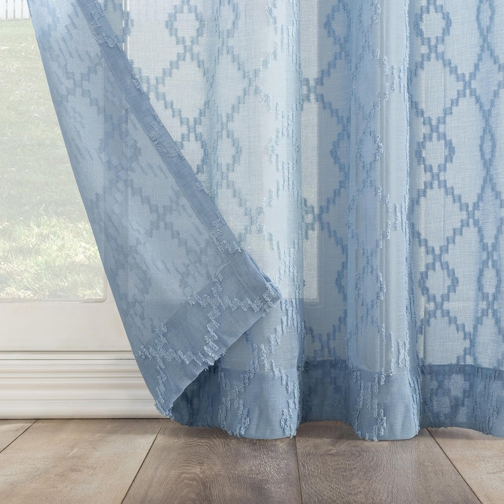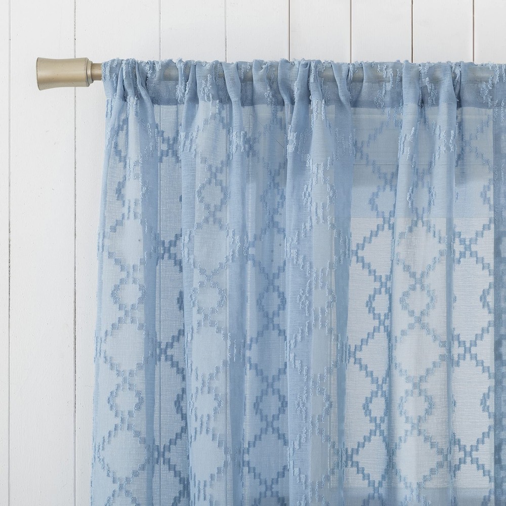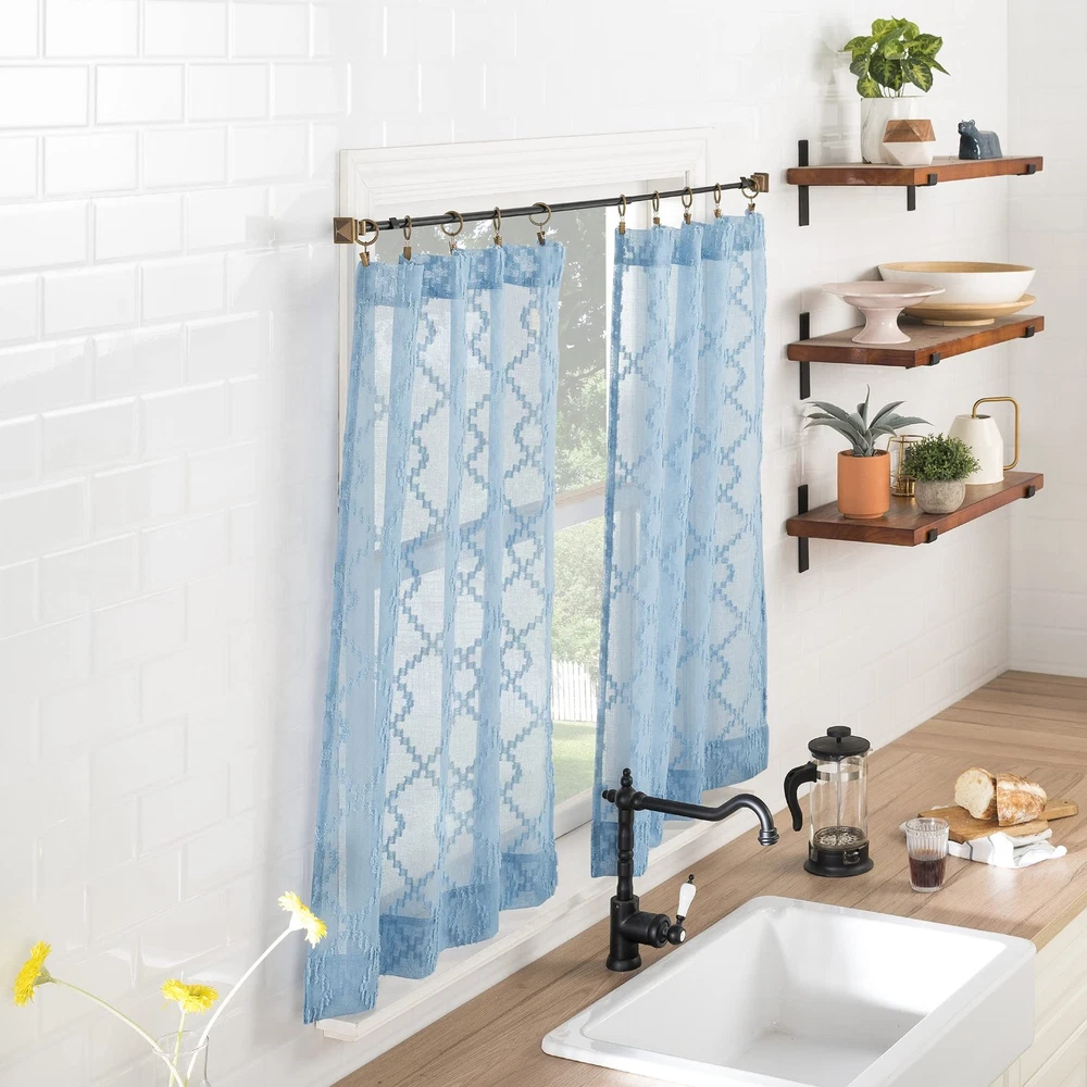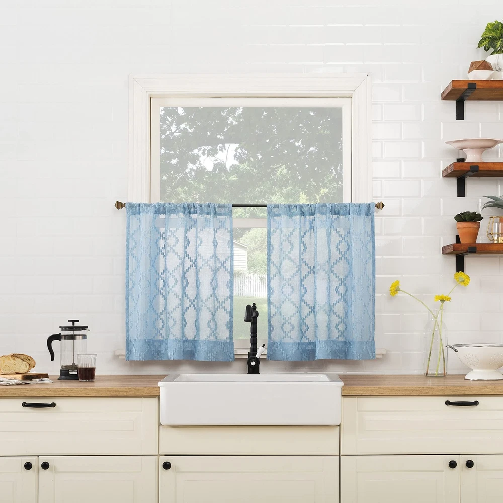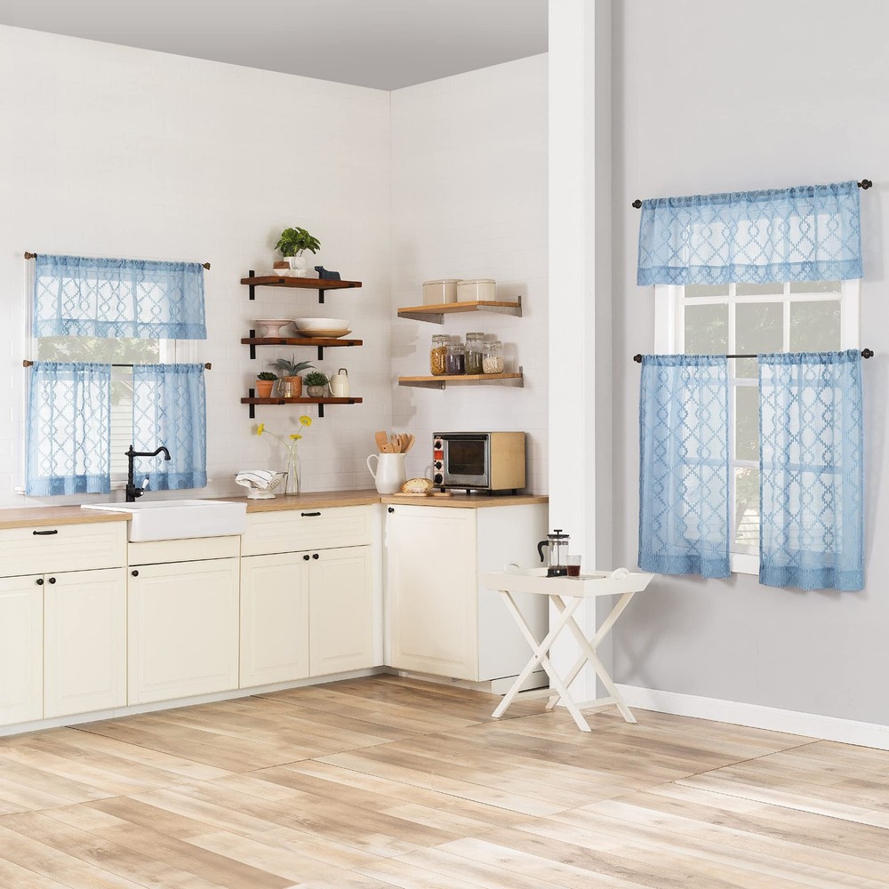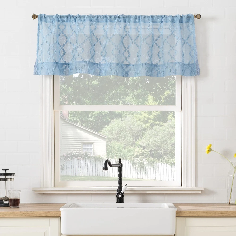 Clipped geometric diamond pattern Gently filters light while enhancing privacy Rod pocket design allows for easy hanging on a standard curtain rod Machine washable Three (3) piece set includes 1 valance and 2 tier curtains