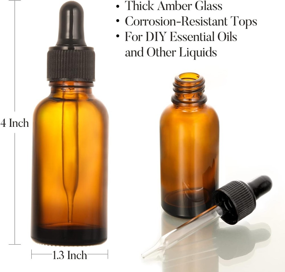 Tincture Dark Amber Dropper Bottles Brown Glass with Funnel and Label Set NEW About this item Size - 1.3 inch wide, 4 inch height. 1 Ounce (30ml) Capacity. Product Includes - 4 pcs dark amber dropper bottles + 1 stainless steel small funnels + 4 kraft paper color labels Leakproof - Great for essential oils, colognes, tincture, cosmetics, perfume oils, beard oil, hair oil or other liquids. Small funnel help fill liquids without leak. Labels help mark names for different liquids. The long dropper almost touches the bottom and can absorb more liquid