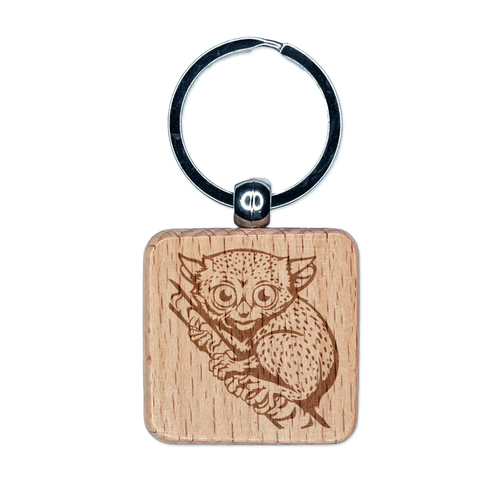Tiny Primate Tarsier Engraved Wood Square Keychain Tag Charm
