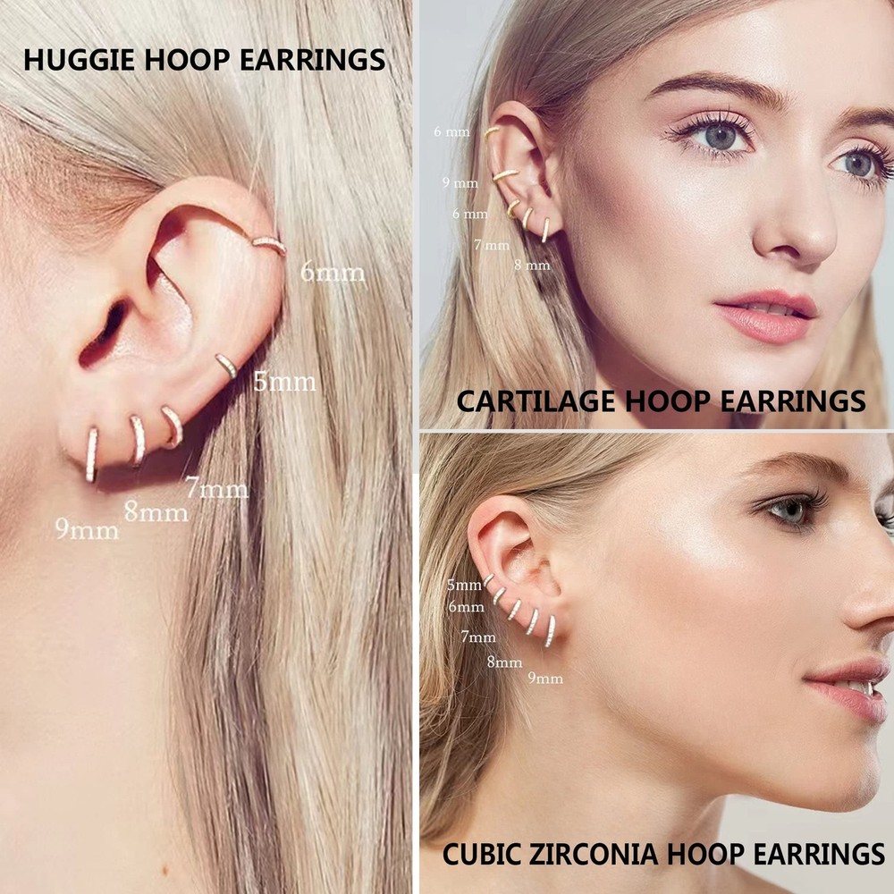 Dainty Tiny White Gold Huggie Hoop Earrings, 5 Pairs Mini Cubic Zirconia Hoops Earring Set for Cartilage Helix Lobe Piercings Small Hoop Earrings 5/6/7/8/9mm for Women Huggie hoop earrings: One package comes with 5 pairs different size mini silver hoop earrings include 5mm 6mm 7mm 8mm 9mm, meet your need for ear multiple piercing. Cartilage hoop earrings: In particular 5mm 6mm 7mm these tiny hoop earrings, are suitable for cartilage/helix/rook/tragus/daith/snug ear piercings. 7mm 8mm 9mm these small hoop earrings suitable for low lobe/2nd lobe/3rd lobe/conch/cartilage/helix ear piercings. Lightweight cute hoop earrings: It is made of very light brass base and plated with 14k gold and white gold. These cz hoop earrings are very light and cute. They can hardly be felt when worn. Cubic zirconia hoop earrings: These small hoop earring inlaid with cubic zirconia. It is sparkling and dazzling that makes you stand out in the crowd, and you will received a lot compliments. Hinged hoop earrings: Every customer is our valuable asset, and we put the customer's needs first. Please feel free to contact us when you have any problems, we will reply and solve within 24 hours. Shipping We offer FREE shipping on all orders! We ship within Three business days of payment, usually sooner. We use a selection of shipping services such as UPS, FedEx, USPS etc. We only ship to the lower 48 states, no APO/FPO addresses or PO Boxes allowed. Local pickups and combined shipping options are not provided at this time. Return You can return a product for up to 30 days from the date you purchased it. Any product you return must be in the same condition you received it and in the original packaging. Please keep the receipt. Payment We accept payment by any of the following methods: PayPal Please pay as soon as possible after winning an auction, as that will allow us to post your item to you sooner! Feedback Customer satisfaction is very important to us. If you have any problem with your order, please contact us and we will do our best to make you satisfied. Contact Us If you have any queries, please contact us via ebay. We usually respond within 24 hours on weekdays. Please visit our eBay store to check out other items for sale! Thank you for shopping at our store.