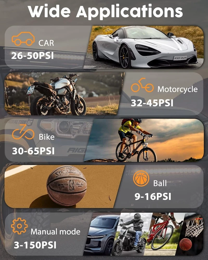 -Brand New - Never Used - Questions: Feel free to ask any Questions - BOX: Never Opened - DESCRIPTION: 【Powerful Output & Faster Inflation】 TGBOX tire inflator powerful motor can provide 150PSI pressure, and 32L/min air flow. 25-35 tires only need 1min, 0-36PSI only need 8 minutes to fully inflate. This bike pump for car is suitable for bicycles, motorcycles, small vehicles, various balls (balloons, basketballs, soccer balls, etc.) 【Tire Pressure Detection & Intelligent Control】 Tire pump has a large LCD digital display screen with 3 pressure measurement units- PSI, KPA, BAR. Real-time reporting of accurate data to know tire pressure at a glance! The bike pump for car also provides you with rest-assured using experience based on the auto shut off function at the desired level. There is no need to worry about over inflating! 【Emergency Charger & Flashlight】 TGBOX car tire inflator can be used as a rechargeable battery to charge your cell phone. The bike pump can be used as a flashlight at night, small and easy to use, put it in your pocket, trunk, etc. 【Compact and Portable】 The portable air compressor Size is 3.1*1.9*5.1 inches, Weight is 1 lb, which is easy to store in a frame-mounted bottle holder, bike saddle bag, and seat packs. It will be a good helper for you on the cycling road! 【Package List】 Tire inflator portable air compressor ✖1, flexbile hose ✖1, Presta/Schrader/Dunlop Valve Adapter ✖1, swimming ring nozzle ✖1, ball needle ✖1, storage bag ✖1, USB charging cable ✖1, user namual ✖1 - OFFERS: Reasonable offers are considered, LOWBALLERS, Best price and Lowest askers will be ignored - all sales final/no refunds/ no exchanges/ no returns - Disclaimer: I do not own the brand's trademarks, logos, pictures, or products posted. I do not intend to infringe on copyright. I find such content available on the internet. Contents are considered fair use. - Tire Inflator Portable Air Compressor, 150 PSI Fast Inflation & Cordless, Air Pump for Car Tires with Rechargeable Battery, Bike Pump for Car, Bicycle, Motorcycles, Ball