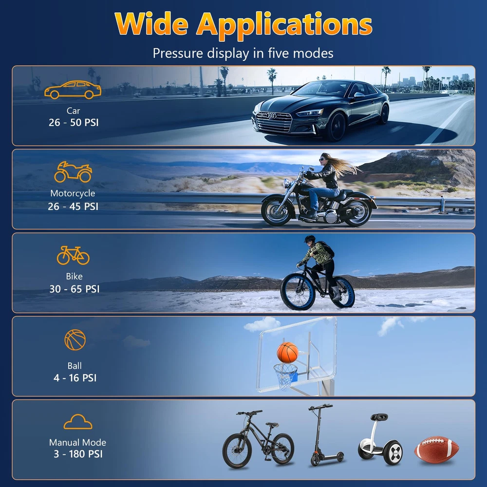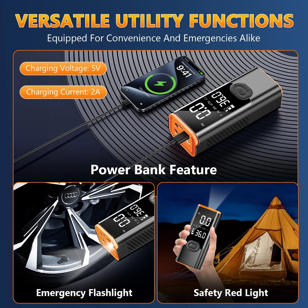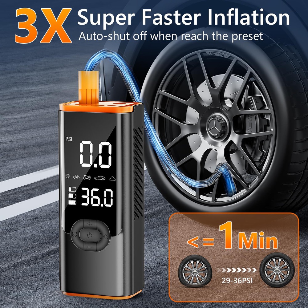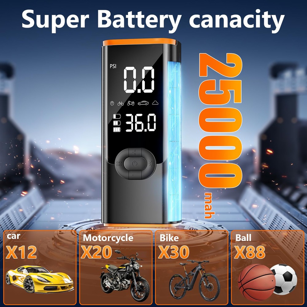 【4X Faster Inflation & Highly Accurate】Car tire air pump portable is the latest design from 2024, and it comes with a high-efficiency motor that boosts inflation speeds up to 36L/Min, so it takes less than 5 minutes to inflate a 195/65/R15 car tire from 0 psi to 35 psi. In addition, our tire inflator portable air compressor is maintained at ±1%. It's the perfect companion for the road! 【Persistent Power Tire Inflator 】Equipped with 25000mAh capacity, the air pressure pump for car tire lasts for 3 hours of continuous use and can be fully charged in just 2-4 hours, and the tire air compressor can be used in two ways, either wirelessly or using the car cord to inflate when the battery runs out. It can inflate 12 car tires or 30 Racing bicycle tires, away from the problem of low power. 【4+N SMART MODES】Tire inflator Portable Air Compressor are preset with 4 pressure units :PSI, KPA, BAR, KG/CM², and four preset inflation modes: bicycle, motorcycle, car, and ball. The fifth custom mode can also set the pressure value according to the inflatable object, simple to use. Tire pump for car portable is an essential product for daily life and travel. 【Accurate LCD Screen & Automatic Stop】The large LCD display shows preset values and real-time pressure values, making it easy to observe and operate at any time. At the same time, tire air compressor can preset and monitor tire pressure, and automatically turn off when the set pressure is reached, preventing excessive inflation. 【Multifunctional Air Compressor】In addition to serving as an portabletire pump for car, it is also a multifunctional emergency tool. It has an LED light at the top that can be used to inflate in the dark, change tires, or warn other vehicles at night. The top also includes a C-type charging port and a 5V/2A USB output port, allowing it to serve as an emergency power source for electronic devices.