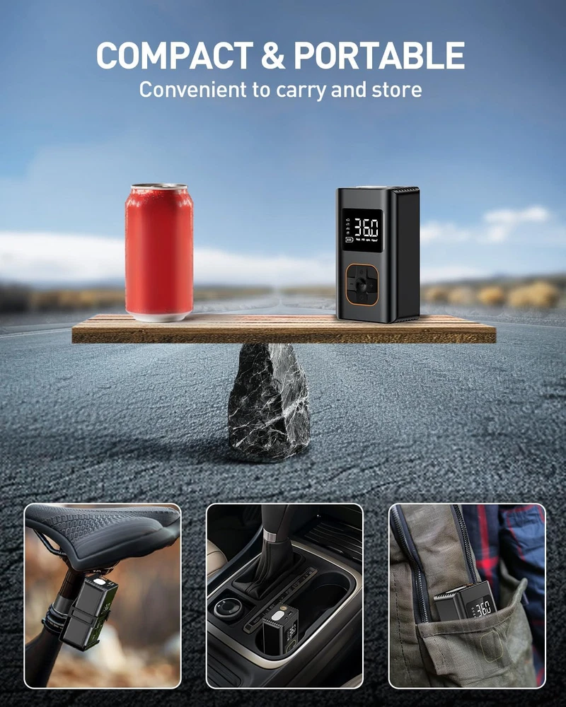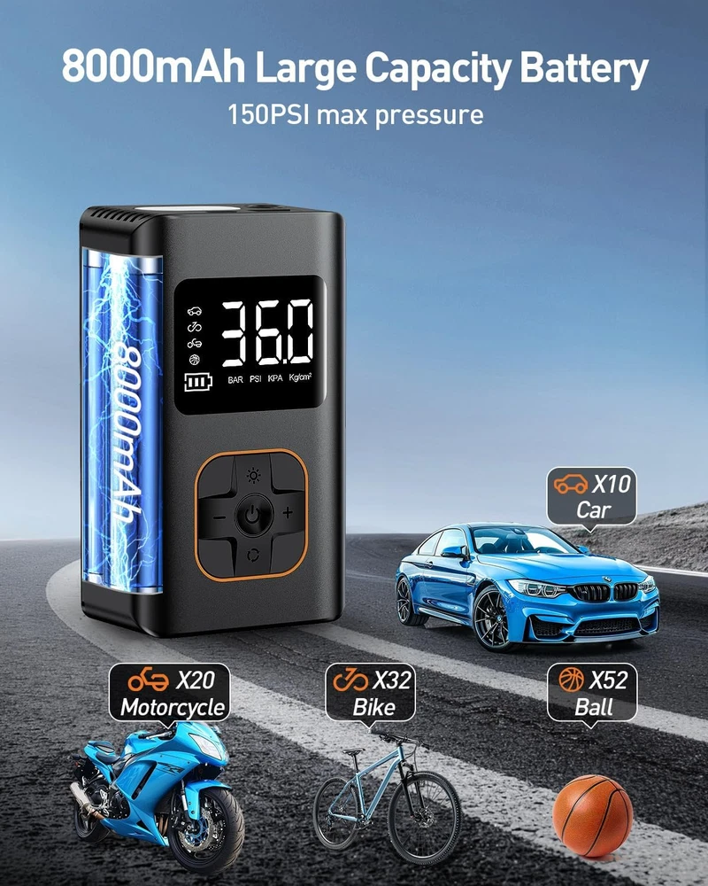 【5X Faster Tire Inflation】: Up to 150 PSI, this powerful smart air compressors has a built-in high-performance chip. Elevate tire pressure from 30 to 35 PSI in just 50 seconds or fully inflate car tires (0-36 PSI) in just 5 minutes. The large LED display shows real-time pressure values and the preset pressure at just a glance 【Long Lasting Battery】: Our portable tire inflator for car has a built-in large-capacity rechargeable battery, With just one full charge, you can inflate four car tires (29-36 psi). This cordless air compressor for car tires is a great solution for emergencies on the way 【5 Smart Modes & Auto Shut Off】:It offers 4 preset inflation modes (bicycles, motorcycles, cars, and balls). Once the preset pressure value is reached, the air pump automatically stops. The fifth custom mode allows you to set pressure values based on the inflation object to meet various inflation needs 【Compact & Portable】The portable air pump adopts a compact cordless design, which is compact and convenient to carry. This cordless air compressor is easy to store in the car, bike rack, or backpack, making it perfect for use on the travel or at home 【All in One Tire Inflator】The air pump has an LED light with three modes at the top, which can be used to illuminate in the dark, and a USB-C input port and a USB-A output port on the top to reverse the power supply and use it as a power bank for your mobile phone. experience Product Description The video showcases the product in use. The video guides you through product setup. The video compares multiple products. The video shows the product being unpacked.