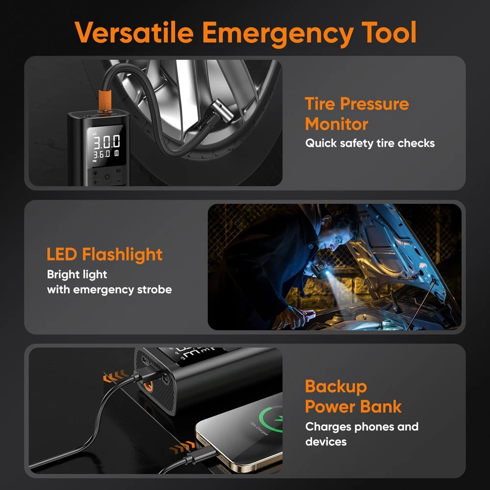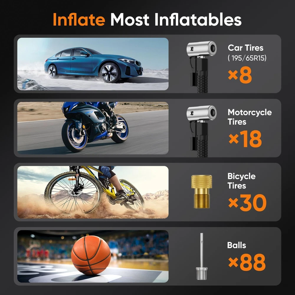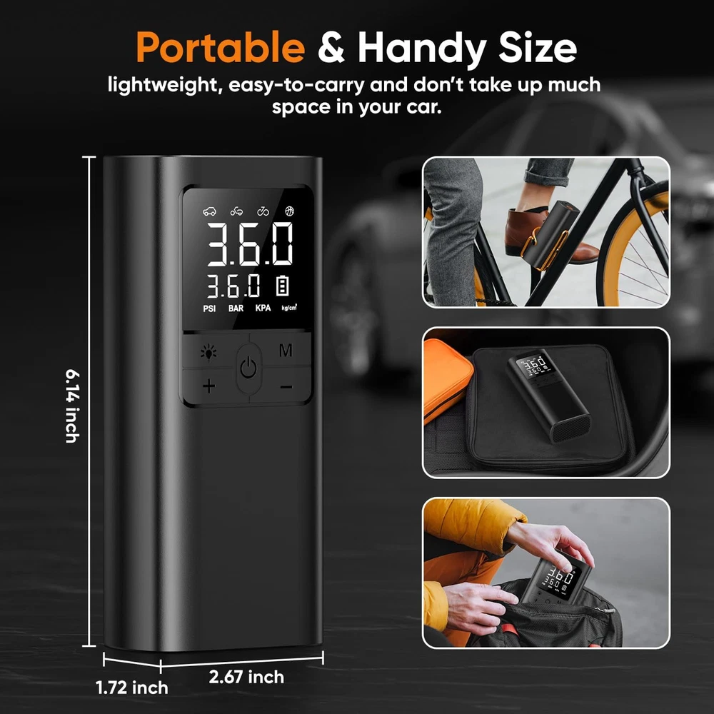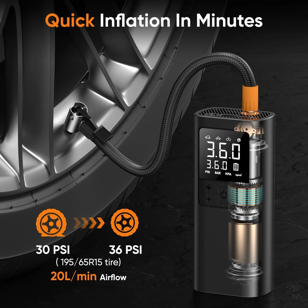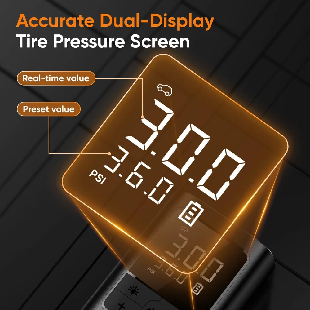 Quick Inflation in Minutes: Built-in 7500mAh large-capacity battery, adopting high-power motor and upgraded cylinder, this portable tire inflator provides up to Max 150 PSI and 20L/min airflow, inflating a 195/65R15 car tire in just 1.5 minutes up to 2X faster inflation. Ideal for maintaining the vehicle optimal tire pressure on daily commutes or long trips Accurate Dual-Display Tire Pressure Screen: Built-in high-precision air pressure sensor, this air compressor accurately detects and monitors tire pressure within ±1 PSI. The digital LED screen shows real-time and preset pressure, inflation mode, and any error messages for a safe and efficient inflation experience Smart 4+N Inflation Modes: This tire inflator offers four pressure units (PSI, KPA, BAR, KG/CM²) and four preset modes for car, motorcycle, bicycle, and ball. A fifth custom mode lets you set pressure from 5-150 PSI based on your various inflation needs(like swimming rings,etc). The user-friendly design makes it easy for even beginners to operate Versatile Emergency Tool: More than just an air pump, this tire inflator portable air compressor includes a 3-mode flashlight(Torch, SOS and Strobe) for inflating in the dark, changing tires or signaling other vehicles at night. Equipped with USB-C and USB ports, it also serves as a backup power source for phones and other electronic devices Auto Shut-Off for Ease and Safety: Simply connect the air hose and press start—the cordless tire pump inflates effortlessly to free your hands, and the air pump will automatically shut off at your preset pressure to prevent overinflation and ensure tire safety Portable Pocket-Size: Weighing just 1.5lbs, cordless design with a storage bag, this portable tire inflator is easy to carry and store in any limited space, such as cars, bike racks or bags. Ideal for home or travel use, it makes a thoughtful gift for men and women on Christmas, Thanksgiving Day, birthdays, etc Product Description