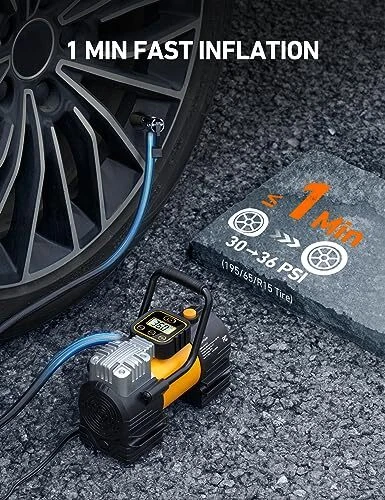 Return Policy Fast Delivery Trusted seller Tire Inflator Portable Air Compressor (Up to 150 PSI) Tire Pump for Car 12V DC Digital Air Pump with 12 LEDs Super Bright Light for Bicycle, Motorcycle, Automotive Car Accessories Product Description Advanced TrueGauge Display: This air pump is equipped with 's upgraded sensor technology, capable of collecting pressure data at a frequency of 200 times per second. The valid data is higher than 80%, 60% higher than the market average. This accurate display ensures safer driving no matter w you roam. Premium Metal Structure: This Portable Tire Inflator’s solid metal structure includes rubber pad to prevent slippage and an ergonomically-designed metal handle for easy movement. Rapid < 1 Min Inflation: The Portable Tire Inflator can inflate a 195/65/R15 car tire from 30 PSI to 36 PSI in just 1 minute. To ensure consistently high performance, we suggest letting the pump cool off for at least 10 minutes after every 15 minutes of continuous use. Portable, Versatile, & Adaptable: The Portable Tire Inflator can be easily stored anyw in your car for instant access thanks to its 3.5*7.1*6.3 in (8.78*18*16 cm) dimensions and 2.08 lb weight. It’s widely compatible with cars, bicycles, motor cycles, SUV tires, balls or swimming inflatables. (NOTE: This inflator is incompatible with truck tires.) What You Get: 1* Portable Tire Inflator, 1*Replacement Fuse, 1*Needle Valve Adapter, 1*Presta-to-Schrader Adapter, 1*Air Nozzle, 1*User Manual. If you have any questions or concerns, feel free to reach out to us! Shipping Returns Payment Shipping Shipping is FREE to all addresses other than APO/PO boxes in the lower 48 states. All our stock ships from US-based warehouses. Shipped via USPS or UPS (depending on location and package weight) Unless stated otherwise, all orders will ship within 24-72 hours of your payment being processed. Check our feedback to see the great reviews of FAST shipping we offer. Returns Seller does not accept returns Payment We currently accept payment via eBay managed payments only. Once payment is cleared, we will dispatch your shipment within 1-3 business days. Please refer to the "Shipping" tab for more information regarding shipping speed to your destination.