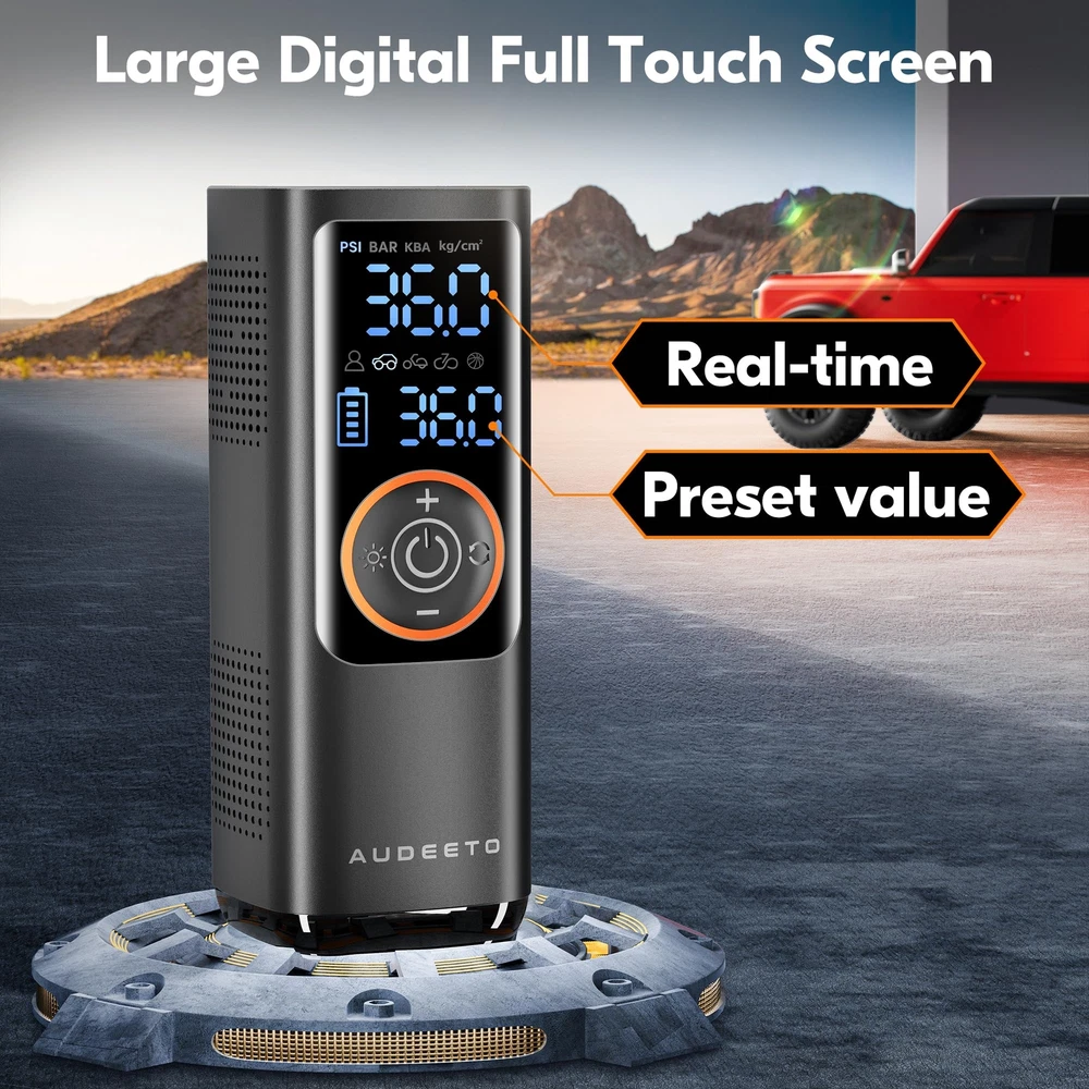 【5X Fast Air Compressor】Vehicle-customize rechargeable battery tire inflator portable air compressor (insert 25mm hybrid electric machine), output airflow 50L/Min continually, inflate Pickup and SUV tire (29-36 PSI) in 60s, 5x ultra faster than other similar product, supplement tire pressure in summer and winter when camping and picnicking, simultaneously save your time. 【Ultra Fast 7800mAh Battery】This A1 air pump for car tires is equipped with 7800mAh super power Hybrid EVE battery(Global Battery Ranking No. 5), this High Density Energy Battery can work continuously for close to 1 hour(real time measurement) , which can refill three and a half tires for SUV, 4 tires for car. Portable cordless design is convenient to keep it in your car. 【Multi-function Air Pump】Our portable air compressor has 5 inflation modes (bicycles, motorcycles, cars, balls and customized mode), for all terrain vehicle, caravans, trailer tire as well, and 4 preset units (PSI, KPA, BAR,KG/c㎡). Once reaching the preset pressure value, the portable air pump will automatically stop to ensure tire pressure monitoring system(TPMS) safety. 【Hybrid Power Tire Inflator】This air compressor for car is equipped with an 20'' high-strength vehicle-grade nylon material air pressure hose, higher heat dissipation and toughness strength,insert cooling fan with 4 regions of special dissipation holes design, effectively extended life span. 【Multi-functional 4 in 1 Device】The functions of this car tire air pump portable are Inflation, Power Bank, Flashlight, and Cigarette lighter port charging, 2 kinds of lights( LED, SOS) for the dark night and emergency situations, it can not only be used wirelessly but also use the car cord to inflate it when it has no power(with a DC cable).