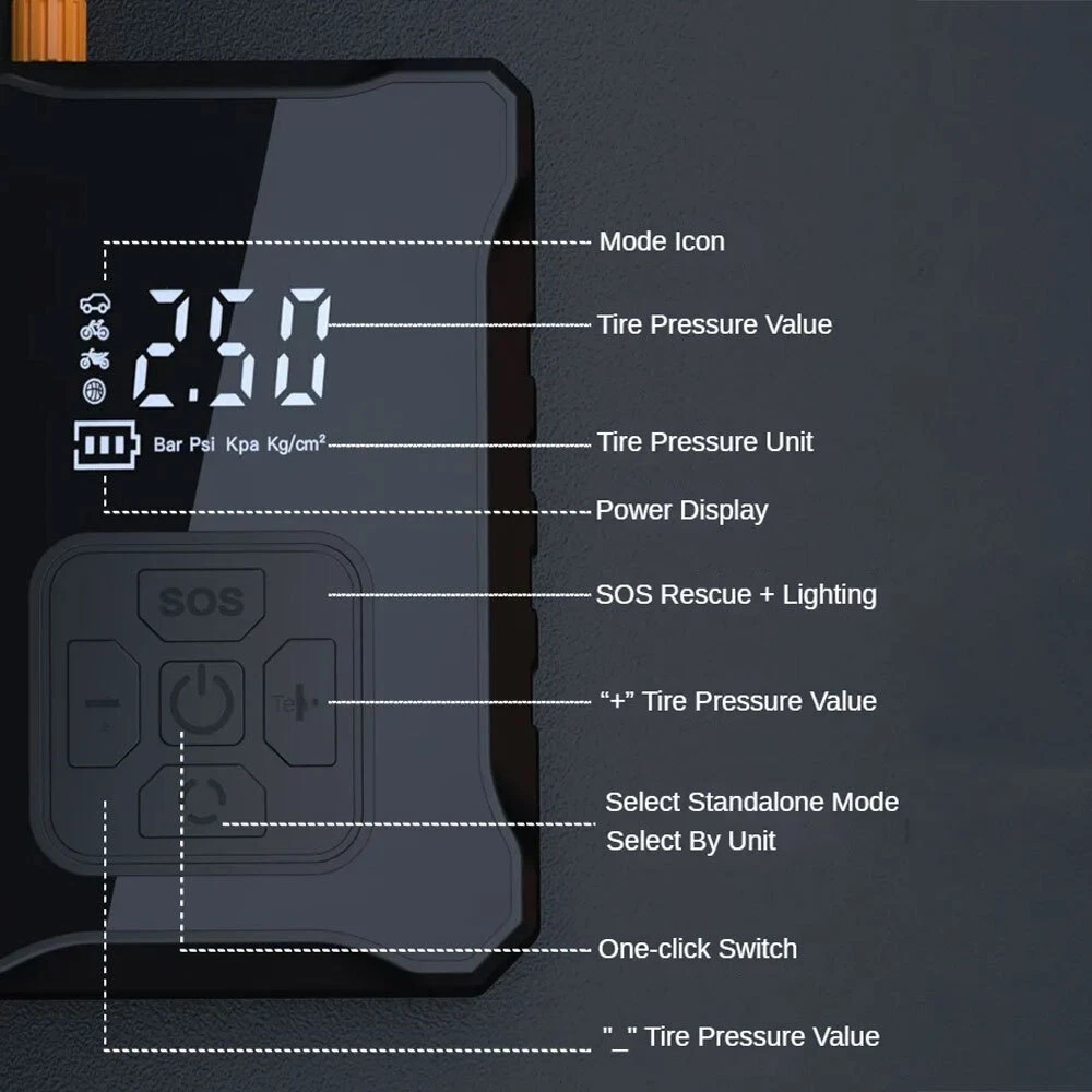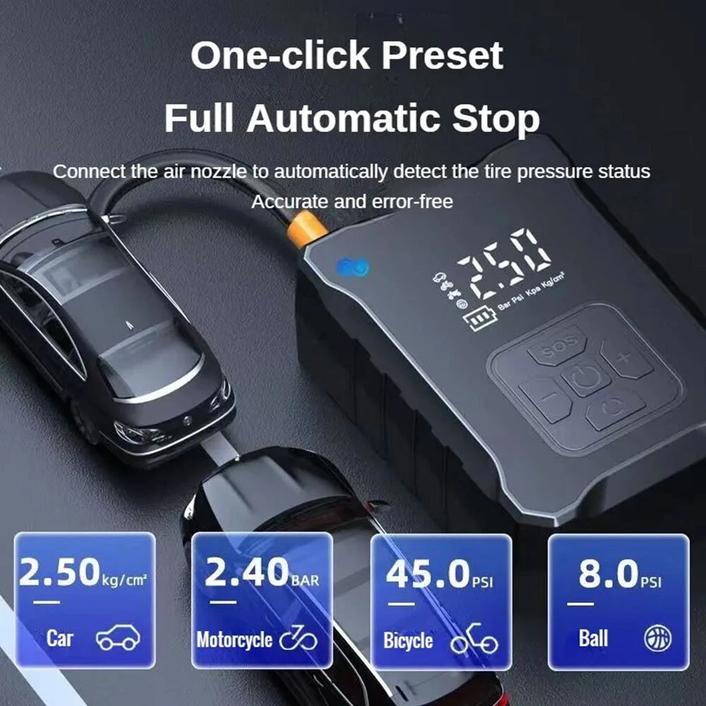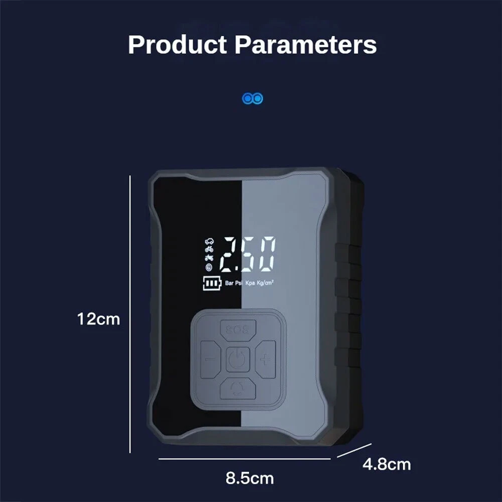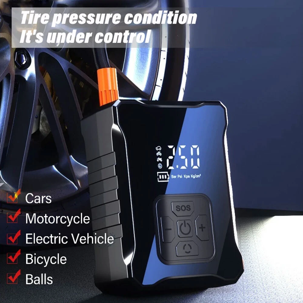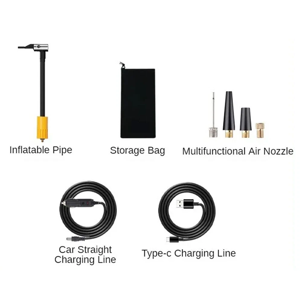 Features : QUICK ACCURATE : Th is a portable tire inflator for car, trucks, SUVs, motorcycles, and bicycles. Quickly inflate your vehicle's tires in just minutes with precision accuracy up to 150 PSI. Small and compact car air pump that fits in your glove box or trunk. FAST INFLATING SPEED and EASY TO USE : Simply plug this auto tire air compressor into the 12V power outlet and attach the hose to the tire you wish to inflate. You can just flip the switch, then shut it off once the tire pressure hits your desired number. 11.5 FEET-LONG RANGE : Besides, the 11.5 ft power cable is long enough to reach all the tires easily. A long cable eliminates needs to unplug it each time. 4 Extra Nozzles : Our tire pump has 4 extra nozzles which allow to inflate all types of tire, such as car, motor, ATV, or midsize SUV, sports equipment and inflatables adaptors included. Perfect for your inflatable boats, balls and other inflatables. PORTABLE & CONVENIENT : The portable air pump with a compact design that measures only 12.1*8.7*4.9cm, much smaller and lighter than a conventional air pump. Powered by rechargeable lithium batteries. You could put it in your pocket, backpack, or car to help you anytime and anywhere.This portable electric pump will get you covered if you are in an emergency! The built-in 2×1800 mAh lithium battery can be used as a power bank for IOS and Android devices. Specifications: Material: ABS Inflation Pressure Range: 0.2-10.3Bar / 3-150PSI. Cylinder Inner Diameter: 17mm Operating Current: ≤6A Working Voltage: 7.4V Power: 90W Type-C Input: 5V/1A. USB Output: 5V/1A Battery: Built-in lithium battery 1800mAh*2 Air Volume: about 18L/MIN. Inflating Efficiency: 195/65/R15 tires, cigarette lighter ≤12min, lithium Battery ≤11min. Life of the whole machine: ≥150 times (195/65/R15 tires. 0-36PSI, every cycle interval is 5 minutes) Measurement Error: ±1psi Working Temperature: -20℃ ~ 60℃ Size: 12.1 * 8.7 * 4.9cm. Certificate: CE/FCC/ROHS/UL/MSDS Applicable Models: Cars, electric cars, motorcycles, bicycles, ball games, etc. Product Lis t : 1 x Inflatable Pump 1 x Cigar Lighter 4 x Inflatable Nozzle 1 x Inflatable Tube 1 x Type-C Charging Cable 1 x Flannel Bag 1 x Instruction Manual