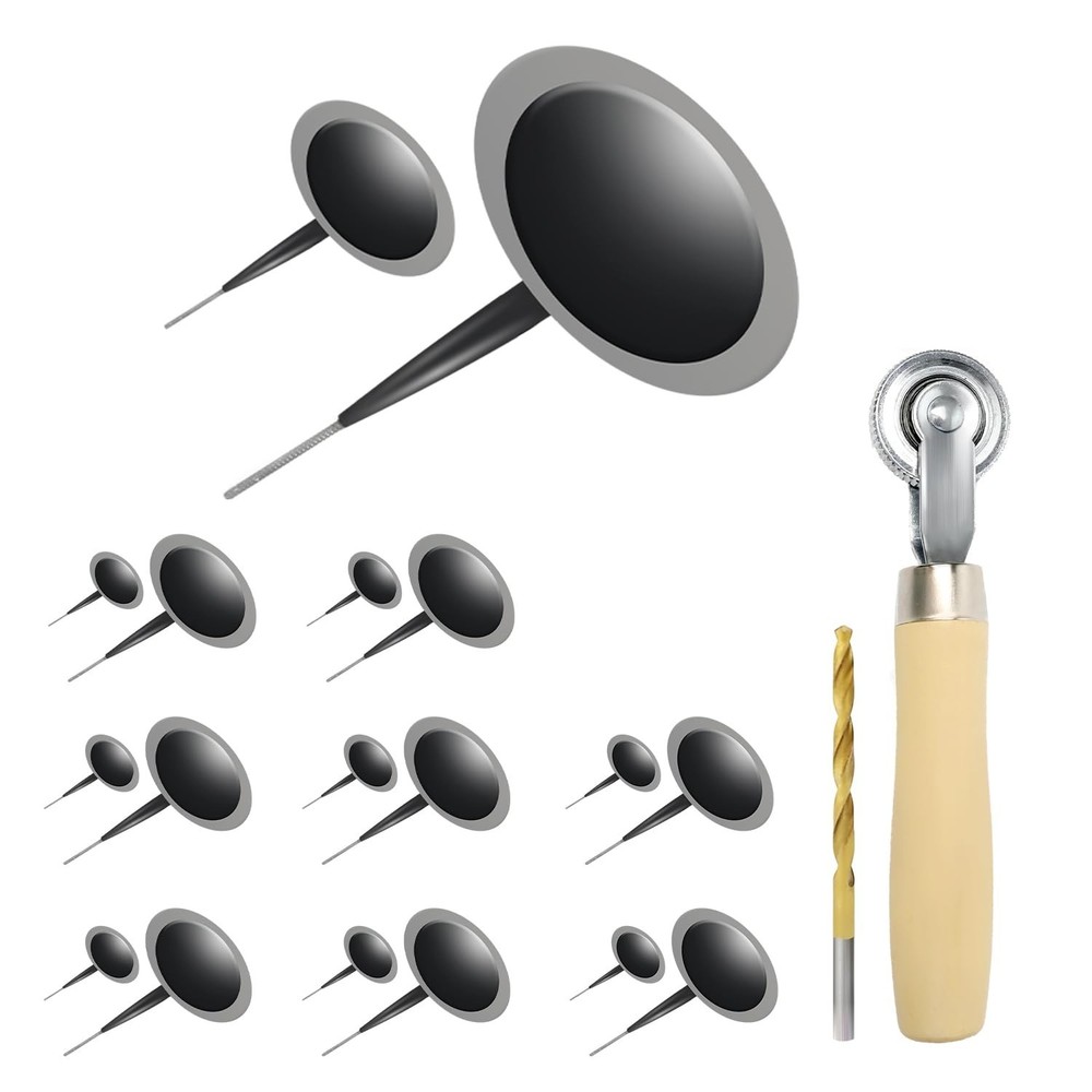 Upgraded Mushroom Tire Plug Kit for Effective Tire Repair Practical Patch Plug: Discover the enhanced design of our mushroom plug kit, featuring rubber rods that effectively fill tire punctures. This innovative solution prevents water and debris from entering, ensuring a complete seal with the round rubber patch. Restore your tire's airtight liner and prevent leaks, especially suitable for small punctures caused by single nails with a crown angle of less than 25°. Premium Material: Crafted from high-quality rubber with a grey vulcanized rubber backing, these tire patch plugs offer exceptional sealing performance and high strength. Experience long-lasting durability with high wear resistance. The round rubber patches partially seal the tire's inner wall, reinforcing it, while the plugs fill the crown wound for waterproof and corrosion resistance. Easy to Operate: Simply punch and polish the worn area of the tire, apply glue (not included), and insert the tire patch plug. Pull the mushroom tire plug outward, remove trapped air with a tire patch roller, and trim off any excess. Note: Rubber cement is not included. Widely Applicable: This versatile tire repair patch plug kit is perfect for repairing pneumatic tires on cars, trucks, bicycles, scooters, motorcycles, buses, electric vehicles, and more. It fits most tire repair work in daily life. Ideal for Tire Repair: Our reliable tire repair patches tools enable you to perform effective patchwork on various tires. Available in different sizes to meet your tire repairing needs, providing you with convenience and peace of mind.