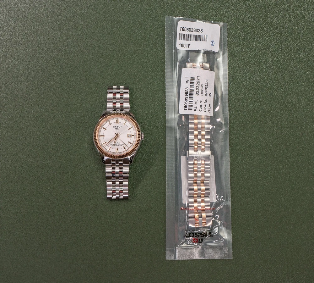 THIS WATCH INCLUDES TWO BRACELET OPTIONS: The stock two-toned rose gold bracelet with butterfly clasp, and the identical construction all-steel version of the same bracelet with butterfly clasp (an additional $250 retail value). The second bracelet was provided by Tissot and includes the original packaging. The dual bracelet option allows for additional flexibility that allows you to chose exactly how much two-toned goodness that you want to wear. Both bracelets quickly interchange with standard springbars, and are currently sized for a 7.5 inch wrist with additional links provided. This watch also includes a Tissot canvas zipper tote bag. TISSOT BALLADE POWERMATIC 80 SILICIUM The Tissot Ballade Powermatic 80 Silicium functions as one of Tissot's flagship models in their brand line up, offering an incredibly refined and sleek model that is great for both the seasoned collector and the high-end consumer alike. With the combination of fluted bezel, gilloche dial to sector dial layout, the ballade takes on a traditional look of elegance that you would often need to pay many thousands of dollars to achieve. The beauty of the Ballade design is the marriage of capability utilising Tissot's construction, both with highly competent movements and durable materials, placed into a platform that can take the knocks of daily life. If you've been looking for a semi-formal watch that can be worn in business formal environments, then dressed down to more casual events with the right strap and bracelet combination, the Ballade is a fantastic choice. This watch is now discontinued and is becoming quite rare and hard to find as a brand new watch. At the pinnacle of Tissot's platform and movement design, The Ballade COSC Silicium uses Tissot's high-end Powermatic Silicium COSC 80-81 movement that offers an 80 hour power reserve that is Swiss Chronometer Certified (COSC). Thanks to the Silicium model's silicone balance spring, the watch maintains a greater level of magnetic resistance when compared to regular watches with a steel balance spring. NOTE: The Powermatic 80 Silicium 80-81 movement is not the same movement used in the PRX. Due to the COSC requirements, the Silicium movement does not use the plastic escapement from the PRX and lower powermatic models. The Powermatic 80 Silicium COSC sits at the top of Tissot's current movement design and capabilities, as the most rugged and accurate movement available in the greater Tissot lineup. Please google "Tissot Powermatic 80 Silicium" for Tissot's video on the movements unique capabilities if you're interested in more information. The watch employs a time-tested and classic two-toned stainless steel case that implements rose gold accents, through to the fine details on the watches' dial. The original bracelet also implements the rose gold accents, however with the secondary bracelet can be swapped over to the steel-only option on the second bracelet. The Ballade uses a surprisingly thin 41mm case design that wears on considerably smaller than the size would suggest, feeling closer to 39mm mm. The watch uses 20mm lugs, making this one an incredible strap monster, capable of taking a range of formal and casual straps. The watch also uses saphire crystal front and back, to increase the durability and scratch resistance of the model. The Tissot Ballade Powermatic 80 Silicium offers an incredible platform to those looking for a more formal watch that doesn't need to be babied or handled with extreme care. While the watch has more formal-looks, the construction, materials and movement scream sports watch, giving the wearer an incredibly accurate and tough watch, that would look completely at home on in a corporate boardroom while also being fully capable on the hiking trail. The Ballade model became the halo watch of the Tissot brand, sitting above even the Gentlemen and PRX models as something a little bit special. This watch is brand new and was purchased for photography and review. The watch includes the original box, manuals, packaging, warranty card, and the additional packaging form the second bracelet. This watch was never worn outside of the photo studio and is in new condition, however there may be very minor surface scratches on the underside of the watch and bracelet from the photography process. The watch case and crystal are immaculate with no signs of wear. This watch sells and ships from Canada and is available for purchase internationally. The buyer assumes responsibility for import duties and taxes on international orders placed outside of Canada. Please refer to your government's websites for imports and international purchases for more information specific to your region. WATCH SPECIFICATIONS: Case Size 41 Case Thickness 9.6 mm Case Material Stainless Steel Case Shape Round Case Back Display Band Band Material Stainless Steel Band Type Bracelet Band Color Two-tone (Silver-tone and Rose Gold PVD), Stainless Steel Band Width 20 mm Clasp Butterfly Dial Dial Color Silver Opaline Type Analog Crystal Scratch Resistant Sapphire Hands Rose Gold-tone Dial Markers Index Second Markers Roman Numerals appear at the 6 and 12 o'clock positions. Arabic Numeral Minute Markers (at 5 minute intervals). Minute Markers around the outer rim Bezel Fixed Bezel Color Rose Gold PVD Bezel Material Stainless Steel Crown Pull / Push Information Brand Tissot Collection Name Ballade Gender Mens Model T108.408.22.278.00 Watch Label Swiss Made Movement Automatic Engine Powermatic 80.811 Power Reserve 80 hours Features Water Resistance 50 meters / 165 feet Calendar Date display at the 3 o'clock position Functions Date, Hour, Minute, Second, Chronometer Watch Features Analog, Stainless Steel, Gold, Chronometer Certified (COSC)