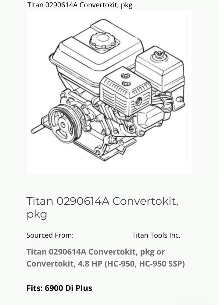 Titan 0290614A CONVERTOKIT, 6900 PLUS, DI PKG and Titan 0290614A Convertokit, pkg are OEM conversion kits for airless paint sprayers made by Titan Tool. These kits are typically used with a Titan PowrTwin 6900 Plus DI airless sprayer and are designed to convert the sprayer’s power source configuration (e.g., from electric to gas-powered or vice-versa), depending on your model setup.  In manufacturer catalog specs, 0290614A appears under Convertokit (120V → Gas Power) for the PowrTwin 6900 Plus DI models — meaning it adapts a 120 V (electric) unit so it can be powered by a gas engine instead. A Convertokit like this lets you change how your sprayer is powered, which is useful if you want to: • Use a gas engine where electric power isn’t convenient. • Swap components between different sprayer setups. • Match your sprayer configuration to jobsite power availability. It’s generally a replacement or conversion part rather than a standalone sprayer — think of it as a special accessory for adjusting your existing equipment’s power style.