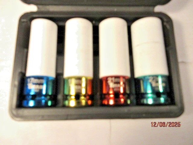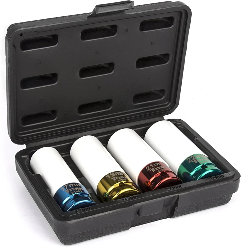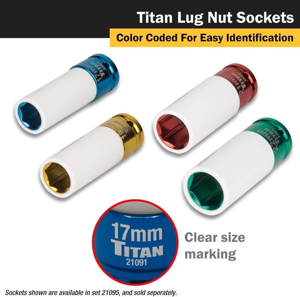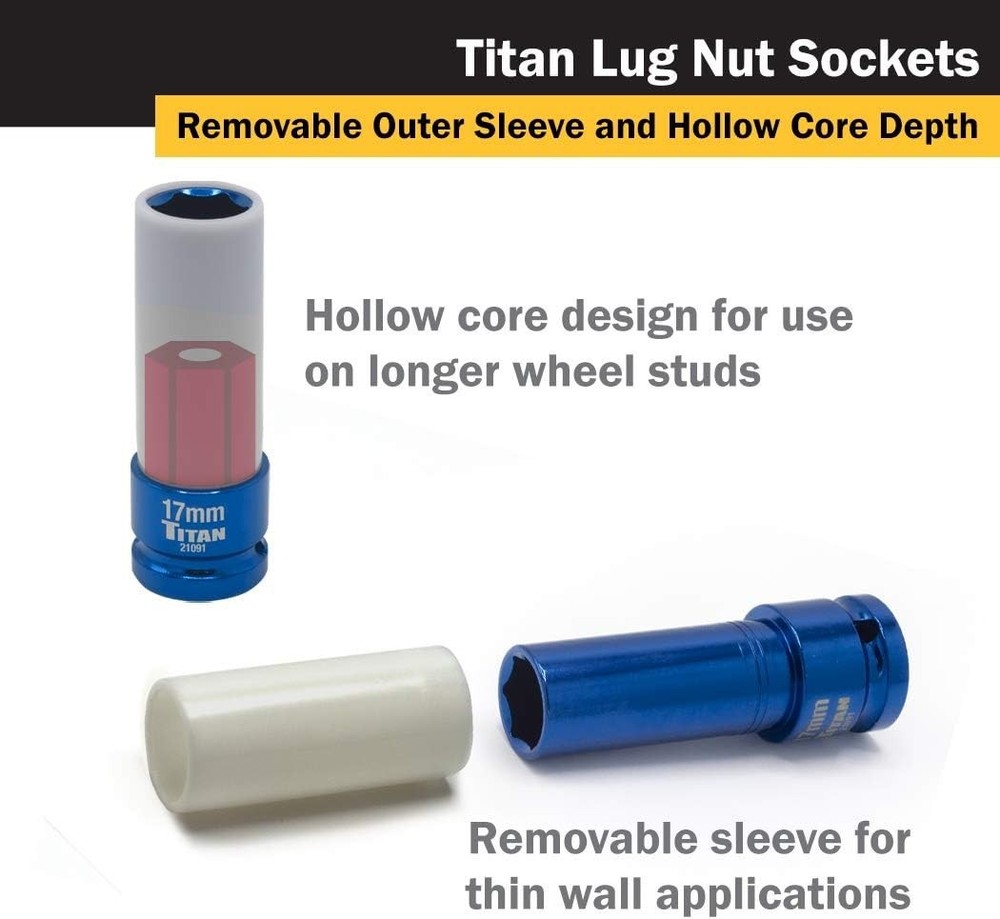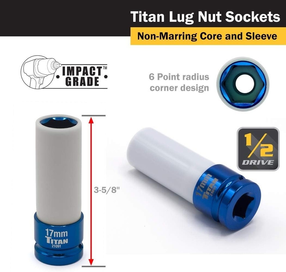 Titan 21095 4-Piece 1/2-Inch Drive Non-marring Impact Deep Lug Nut Socket Set About this item 1/2-Inch Drive x 17mm, 19mm, 21mm and 22mm deep socket | 6-Point | 3-5/8-Inch overall length Impact grade lug nut socket is constructed of chrome-moly steel for strength and durability Features a non-marring core and sleeve that prevents damage to wheels, custom rims and lug nuts | outer sleeve can be removed for thin wall applications Hollow core design for use on longer wheel studs | color coded for easy identification