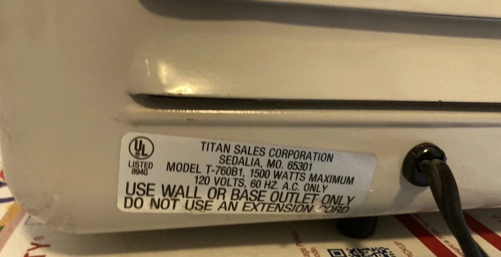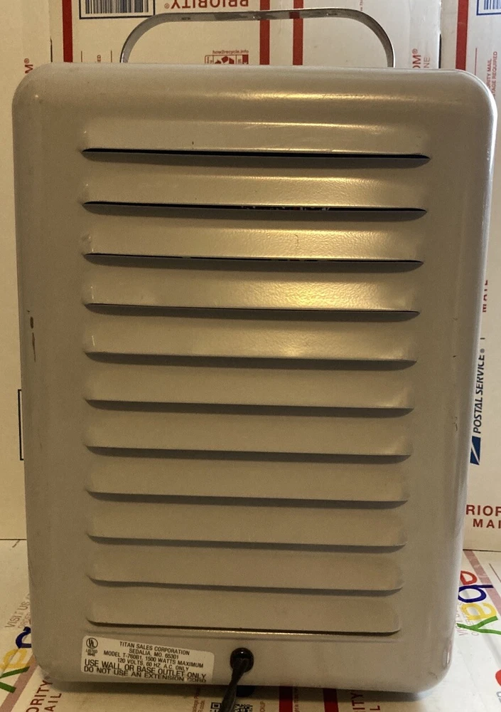 Brand: Titan Heating Element Format: Coil MPN: T-760/1, T760B1 Number of Heat Settings: 2 Model: T760B1 Type: Portable Heater Control Style: Dial, Switch Tank Capacity: na UPC: 051871007605 Voltage: 120 V Color: Gray Item Width: 10" Material: Steel Power Source: Electric Country/Region of Manufacture: United States Item Depth: 8" Item Length: 16" gtin13: 051871007605 Mounting Location: Floor Power: 1300/1500 Watts Heating System: Forced Air/Fan