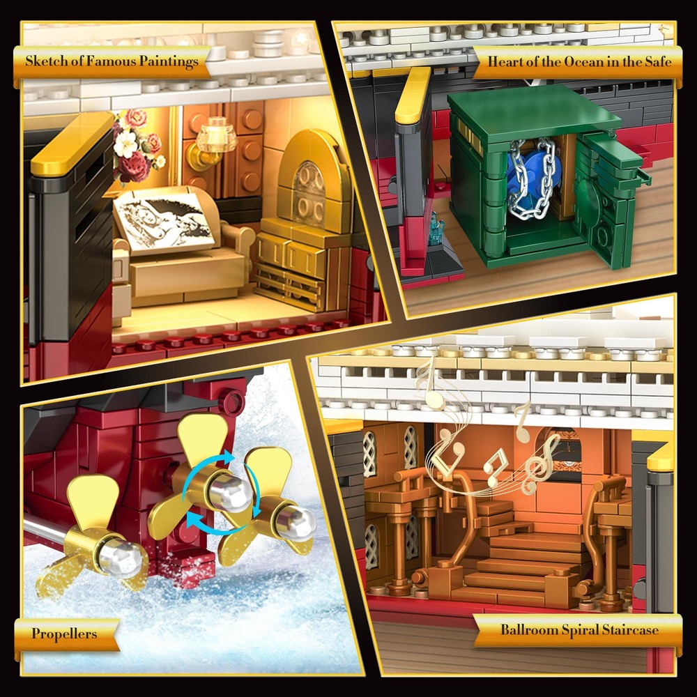 Features and Functions 1. Superbly detailed with three hidden rooms inside the hull. 2. Comes with light strips to add a luxurious ambiance. 3. Richly decorated with glacier, display stand, rotatable propeller, chimney ect. 4. Two modes of driving and shipwrecking, relive the classic. 5. High quality material, easy to assemble and disassemble. 6.Colorful step-by-step instructions and numbered bags for easy assembly. Product Information Number of PCS: 2288 Pieces Material: ABS Dimensions: 24.5X3.4X10in Age of use: 8+ We Provide You with Satisfactory After-sales Service Before the product is packaged, we go through several rounds of inspection to ensure that the accessories are complete. If you find that some parts are missing during the building process, please feel free to we will try our best to provide you with a good solution. [Recreating Titanic] This ship model is a perfect replica of the titanic from the movie. The hull is very detailed with three rooms hidden inside the ship. It is also comes with light strip to add to the luxurious ambiance. The boat is equipped with rotatable propellers and chimneys to restore the scene when the ship is sailing. Bring you an immersive journey to the titanic. [High-Quality Materials] The titanic building set is made of ABS plastic certified to international environmental standers and tested by ASTM963-17 and CPSIA. After 10 industrial processes, precise CNC cutting and advanced color processing, ensure that each piece is firmly connected not deformed or faded. There is no irritating smell and the blocks are very comfortable to touch. Designed for building enthusiasts. [Abundant Accessories] Our big size technic boat contains 2,288 blocks that can be assembled into a beautiful luxury cruise ship display vessel. The ship is richly decorated with glaciers, block display stands, LED light strips and more. Realistic reproduction of the prototype, hands-on creation of a variety of beautiful scenes, let you relive the classic. [Highly Playable] This titanic model kit is designed with a 2-in-1 model of driving and shipwreck. The hull can be disassembled and separated, equipped with a glacier can simulate the scene when the shipwrecks. This structural architecture is more playable. The hull structure is stable and the model is solid no matter in driving or wrecking mode. When assembling this titanic toy ship, you can not only experience the fun of creation, but also feel the charm of the sea world. [Creative Gift] The beautiful boat building set is definitely a great gift idea. Our titanic set is both meaningful and luxurious. Make it a unique birthday gift or Christmas present and whoever receives it will love it. In addition, this big boat building set is also a displayable piece of art that you can put in your home or office and it will make a stunning decoration. The finished ship measures 24.5 inches (L) x 3.4 inches (W) x 10 inches (H).