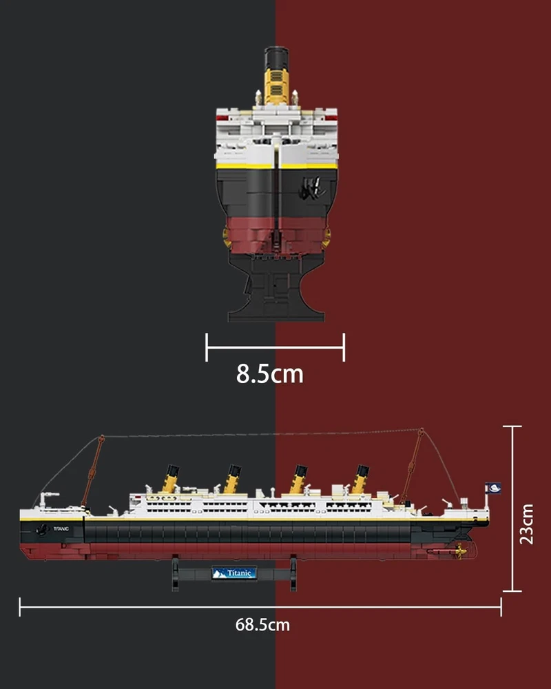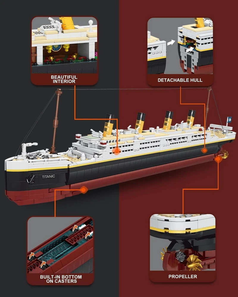 These are the dOvOb blocks, compatible with major brands. Titanic Model Building Blocks Set Contains 2022 Pieces Building Bricks. Detailed step-by-step color instructions, Great details with assorted sizes and color pieces, have fun. A Great Gift, Perfect gift for both adults and ages 12 years up children. Collectible set, perfect size to display. 26.9 Inches Long. Product description The Bow Realistic appearance comes from reality. The Hull Detachable hull and beautiful interior. The Stern A propeller is installed under the stern.