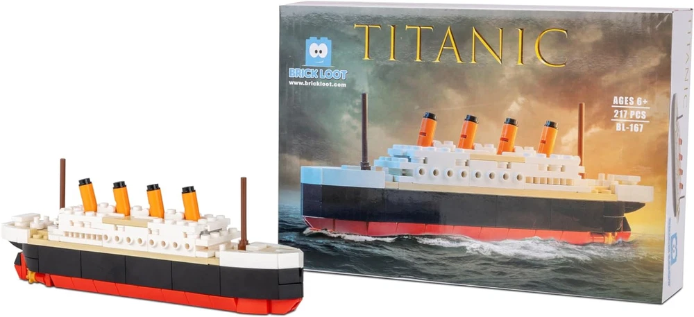 TITANIC BUILDING BRICKS: Now you can build your very own Titanic Model and sail away… recreate the well known story or create your own adventure! With authentic details, Brick Loot's Titanic Model Kit is beautiful for display and strong enough for play. ENHANCES CREATIVITY: With 217 bricks included, this building set helps to enhance creativity & hand-eye coordination. Whether you're a creative brick building enthusiast or a beginner, this basic building kit is for you. SAFE AND COMPATIBLE: Our model building kits offer a seamless building experience for both adults and kids. They're 100% compatible with LEGO and all other major brands allowing for easy assembly and made entirely of high-quality ABS plastic, ensuring a safe building experience. PERFECT GIFT: Give the gift of creativity to family and friends! Our toy building sets are an engaging way to enhance creativity and motor skills, making them a fun gift idea for girls, boys, women, or men. Gift it for birthdays, holidays, any special occasion. SPECIFICATIONS: Mid-Sized Set: 217 Pieces, Dimensions: 8 inches from bow to stern and 3 inches tall, Material: ABS Plastic, Recommended Ages: 6 and up. Brick Loot building bricks are compatible with all major brands that sell toy bricks, base plates, and building blocks for adults and kids. Product Description You can now build your own Titanic model and sail away… recreate the well known story or create your own adventure! With authentic details, the Brick Loot Titanic Building Bricks Set is a beautiful model for display and strong enough for play. This Titanic Model is 8 inches long and 3 inches tall and designed to stand the test of time. Brick Loot Titanic Building Bricks Set Brick Loot - Our Story Brick Loot was founded in 2013 by incredibly motivated 9-year-old Parker Krex. His true passion for sharing LEGO with the world began at age 4 when he first shared his massive collection of bricks on YouTube. A creative and entrepreneurial mastermind, Krex continues to impress the brick-building community with new ways to design and enjoy brick products. In addition to his studies, he currently works as Brick Loot's CEO (Chief Entertainment Officer). We specialize in creative monthly subscription boxes with unique LEGO and brick builds, custom LED lighting kits for LEGO, and high-quality custom brick and minifigure sets for individuals and corporations. Why we are different? Our mission is to celebrate and enhance the brick-building experience for brick builders all over the world. We thoughtfully select and design each product to meet this mission and we are dedicated to manufacturing creative, high-quality products that will delight our customers. Brick Loot Titanic Building Bricks Set Authentic Details The Brick Loot Titanic Set will please any history buff! This model includes authentic details, colorful smokestacks, portholes, lifeboats, and much more. We provide easy-to-follow, step-by-step instructions to make assembly fun! Specifications Our kit includes 217 high-quality pieces that have been carefully manufactured for the Brick Loot Titanic Model. This custom set is durable for play and beautiful on display: it is 8 inches from bow to stern and 3 inches tall. High-quality Materials, 100% Compatible Construction We use only high-quality ABS plastic in the manufacturing process to create custom-molded, colorful, and highly-detailed bricks that fit together perfectly. We care about the build quality of each part! Brick Loot bricks and accessories are 100% compatible with LEGO and all major brand brick brands, should you choose to use these bricks for another build in the future! Dependable. Transparent. Supportive. Brick Loot is a company of brick specialists who love to create one-of-a-kind brick products. We create monthly subscription boxes with unique LEGO and brick builds, custom LED lighting kits for LEGO, and high-quality custom brick and minifigure sets for individuals and corporations. Brick Loot products are designed to support lateral thinking and planning skills and encourage creative and cooperative opportunities for enriching play for brick enthusiasts of all ages! It is extremely important to us that our customers are enjoying our products as much as we do. Your satisfaction is always our goal! *The LEGO Group of companies does not sponsor, authorize or endorse this product.