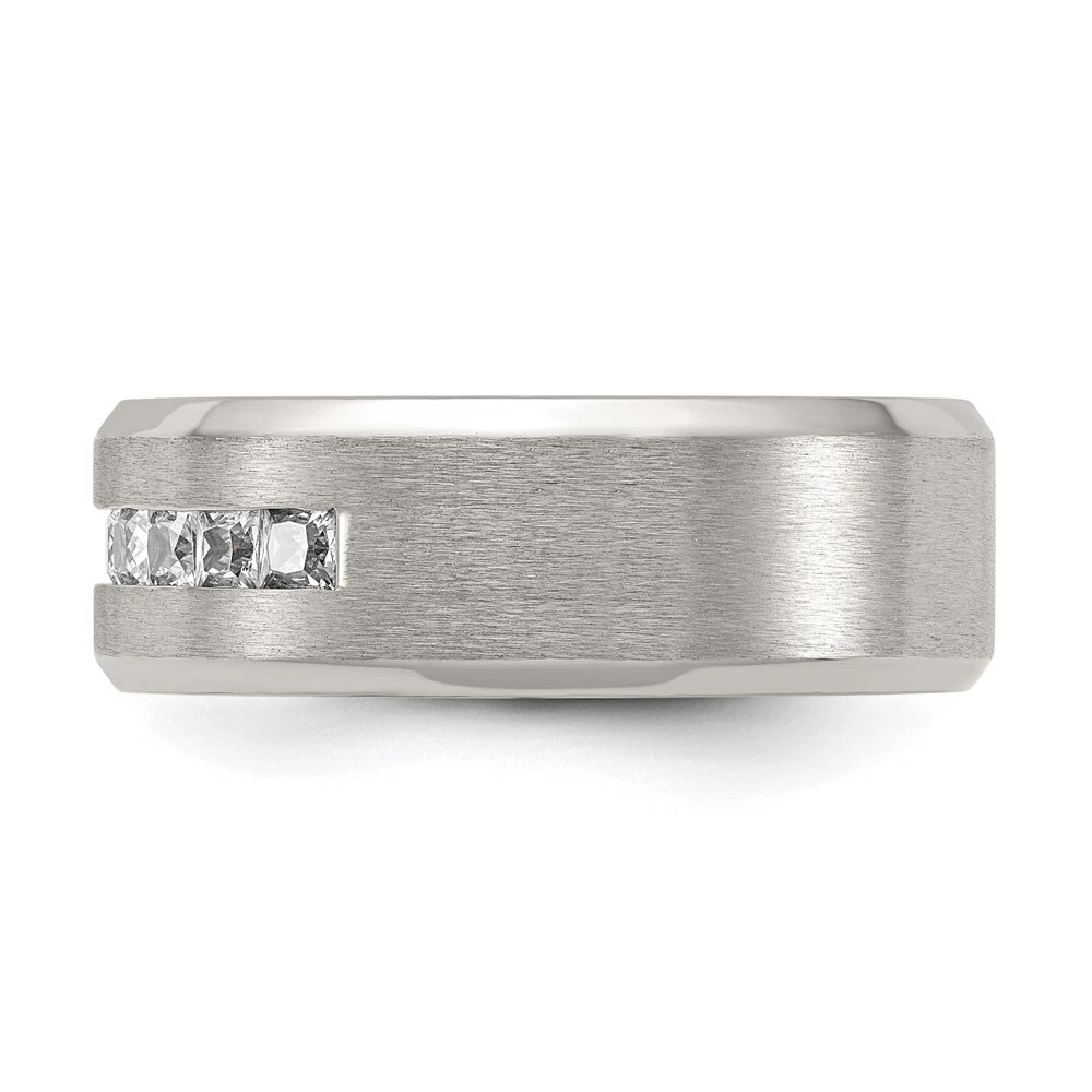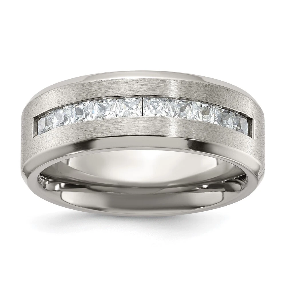 Finish:Polished & Brushed|Stone Type_1:Cubic Zirconia (CZ)|Stone Quantity_1:10|Band Width:8 mm|Stone Setting_1:Channel Set|Material: Primary:Titanium|Stone Shape_1:Square|Stone Size_1:2.5 mm|Stone Treatment_1:Synthetic|Item Weight U/M:gm|Width of Item:8 mm|Packaging:Gift Pouch|Product Type:Jewelry|Jewelry Type:Rings|Sold By Unit:Each|Gender:Unisex|Material: Primary - Color:Grey|Ring Type:Wedding Bands|Stone Creation Method_1:Synthetic All weights and measurements are approximate and may vary slightly from the listed information. Welcome to diamond_6720 Payments We accept all Ebay approved payment. Please sent the payment to us within 8 days after the auction has ended, or you will have unpaid case auto open by eBay. Shipping Policy We will ship all items within 1 business days of purchase during the work week (M-F) excluding holidays. If you order on Friday, your order will be shipped the following business day. Tracking will be provided when it becomes available. We will only ship to a PayPal Verified Address. Please make sure your address is current and correct. If the information does not match, your order may be canceled. Buyers are responsible for all customs, duties and taxes for your respective countries. Delivery times for International Shipping will vary. California Buyers Pay 9.0% Tax on all orders. case auto open by eBay. Return Policy & Exchange Returns or Exchange are accepted. Buyer must contact us within 30 days after the item is received. Item must be returned in unworn and resalable condition. We will only issue a refund for the purchase price, excluding any shipping fees. If we are at fault, we will provide a full refund. Buyer is responsible for all return shipping costs. BUYERS FEEDBACK If you have any concerns regarding your purchase, please contact us via eBay Message, we assure you that a satisfactory resolution will be reached. Your feedback is very important to us Do remember to give us 5 star rating(*****) if you are satisfied with our product & service .