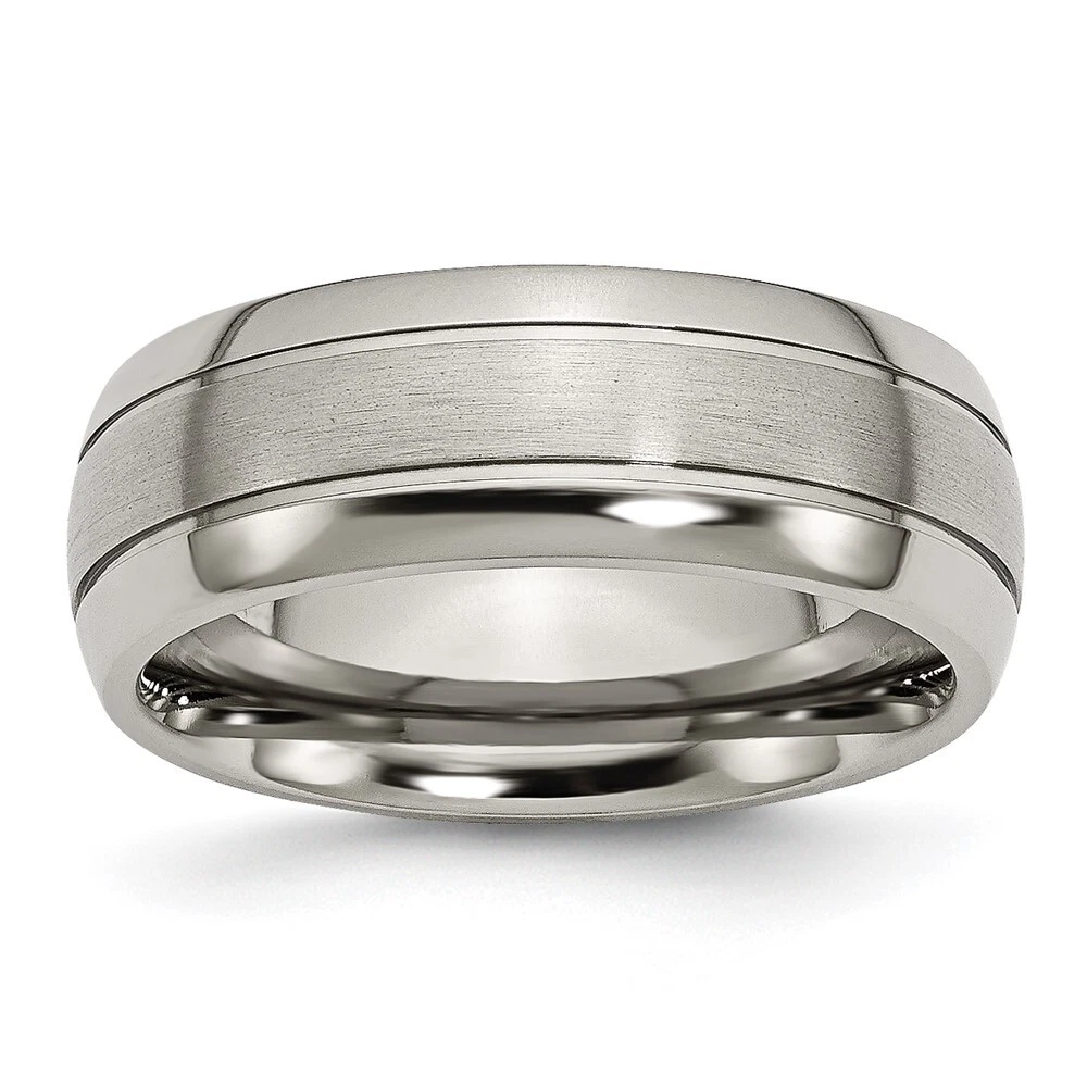 Finish:Polished & Brushed|Band Width:8 mm|Material: Primary:Titanium|Ring Fit:Comfort|Sizeable:No|Thickness:< 2.5 mm|Item Weight U/M:gm|Width of Item:8 mm|Engravable:Yes|Packaging:Gift Pouch|Product Type:Jewelry|Jewelry Type:Rings|Sold By Unit:Each|Gender:Unisex|Texture:Grooved|Material: Primary - Color:Grey|Ring Type:Wedding Bands|Edge Type:Flat|Ring Shape:Half Round All weights and measurements are approximate and may vary slightly from the listed information. Welcome to diamond_6720 Payments We accept all Ebay approved payment. Please sent the payment to us within 8 days after the auction has ended, or you will have unpaid case auto open by eBay. Shipping Policy We will ship all items within 1 business days of purchase during the work week (M-F) excluding holidays. If you order on Friday, your order will be shipped the following business day. Tracking will be provided when it becomes available. We will only ship to a PayPal Verified Address. Please make sure your address is current and correct. If the information does not match, your order may be canceled. Buyers are responsible for all customs, duties and taxes for your respective countries. Delivery times for International Shipping will vary. California Buyers Pay 9.0% Tax on all orders. case auto open by eBay. Return Policy & Exchange Returns or Exchange are accepted. Buyer must contact us within 30 days after the item is received. Item must be returned in unworn and resalable condition. We will only issue a refund for the purchase price, excluding any shipping fees. If we are at fault, we will provide a full refund. Buyer is responsible for all return shipping costs. BUYERS FEEDBACK If you have any concerns regarding your purchase, please contact us via eBay Message, we assure you that a satisfactory resolution will be reached. Your feedback is very important to us Do remember to give us 5 star rating(*****) if you are satisfied with our product & service .