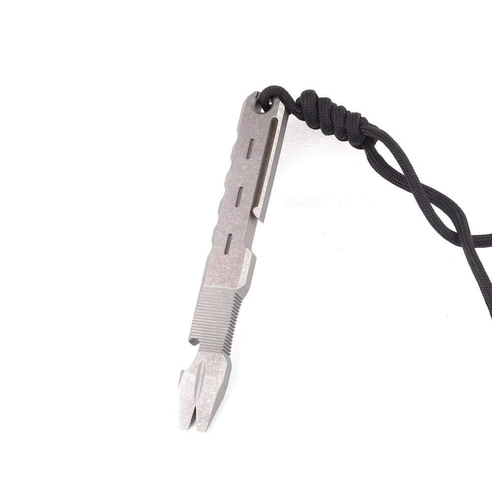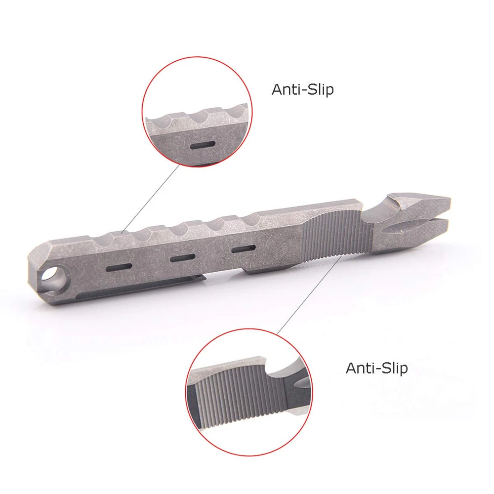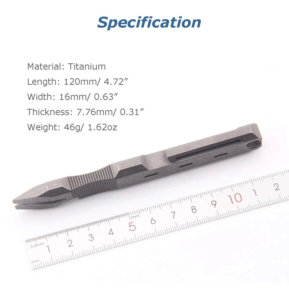 All-in-Design. EDC multi tool, with multi functions of thumbtack puller, box opener and bottle opener. Pry end could be used to open the clear box tape on the package. If you are like most people who are looking for a convenience in EDC tool, you'll be glad with the functional all-in-EDC tool. Clip & Lanyard Hole Design. With the lanyard hole and pocket clip design, could be attached to your clip to your belt loop or pocket, which is convenient to carry. Portable & Compact. Weight only 1.62oz/ 46g. 4.72"/ 120mm in length, 0.63"/ 16mm of width and 0.31"/ 7.76mm in thickness. Anti slip design for convenient using. A good EDC tool for outdoor camping hiking, a great addition to you EDC gear. Made of TC4 titanium alloy material. High strength and corrosion-resistant. A multi EDC tool for everyday carry to use, not suitable for large heavy work.
