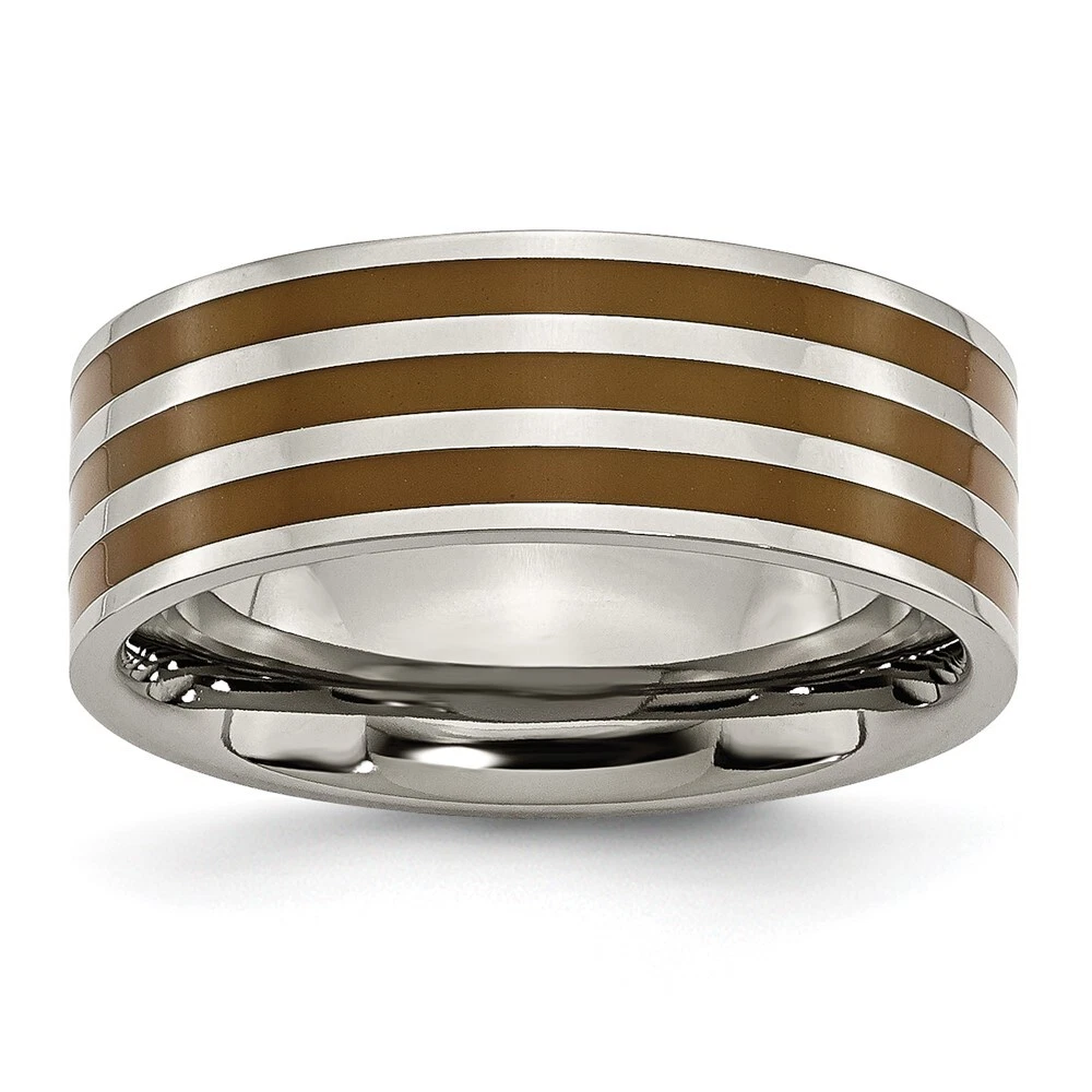 Finish:Polished|Material: Accents:Enamel|Material: Accent Color 1:Brown|Band Width:8 mm|Material: Primary:Titanium|Ring Fit:Standard|Sizeable:No|Thickness:< 2 mm|Item Weight U/M:gm|Width of Item:8 mm|Engravable:Yes|Packaging:Gift Pouch|Product Type:Jewelry|Jewelry Type:Rings|Sold By Unit:Each|Gender:Unisex|Material: Primary - Color:Grey|Ring Type:Wedding Bands|Edge Type:Flat|Ring Shape:Flat All weights and measurements are approximate and may vary slightly from the listed information. Welcome to diamond_6720 Payments We accept all Ebay approved payment. Please sent the payment to us within 8 days after the auction has ended, or you will have unpaid case auto open by eBay. Shipping Policy We will ship all items within 1 business days of purchase during the work week (M-F) excluding holidays. If you order on Friday, your order will be shipped the following business day. Tracking will be provided when it becomes available. We will only ship to a PayPal Verified Address. Please make sure your address is current and correct. If the information does not match, your order may be canceled. Buyers are responsible for all customs, duties and taxes for your respective countries. Delivery times for International Shipping will vary. California Buyers Pay 9.0% Tax on all orders. case auto open by eBay. Return Policy & Exchange Returns or Exchange are accepted. Buyer must contact us within 30 days after the item is received. Item must be returned in unworn and resalable condition. We will only issue a refund for the purchase price, excluding any shipping fees. If we are at fault, we will provide a full refund. Buyer is responsible for all return shipping costs. BUYERS FEEDBACK If you have any concerns regarding your purchase, please contact us via eBay Message, we assure you that a satisfactory resolution will be reached. Your feedback is very important to us Do remember to give us 5 star rating(*****) if you are satisfied with our product & service .