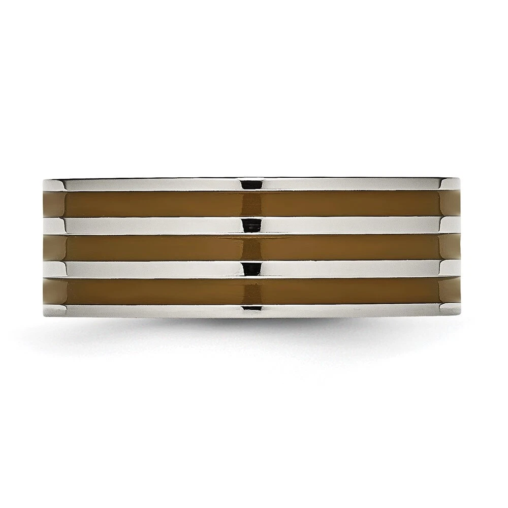 Titanium Polished Brown Enamel Striped 8mm Flat Band Ring Size 8