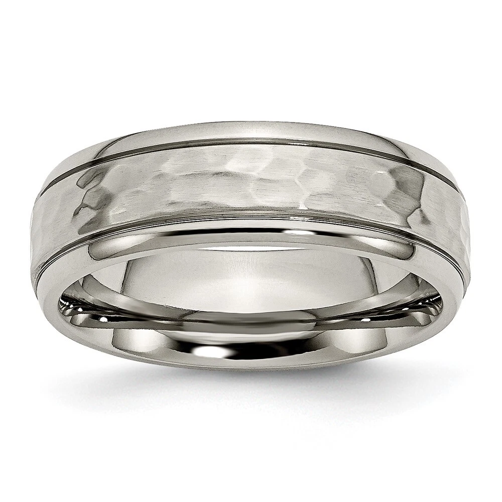 Titanium Polished and Hammered 7mm Grooved Edge Band Ring Size 6
