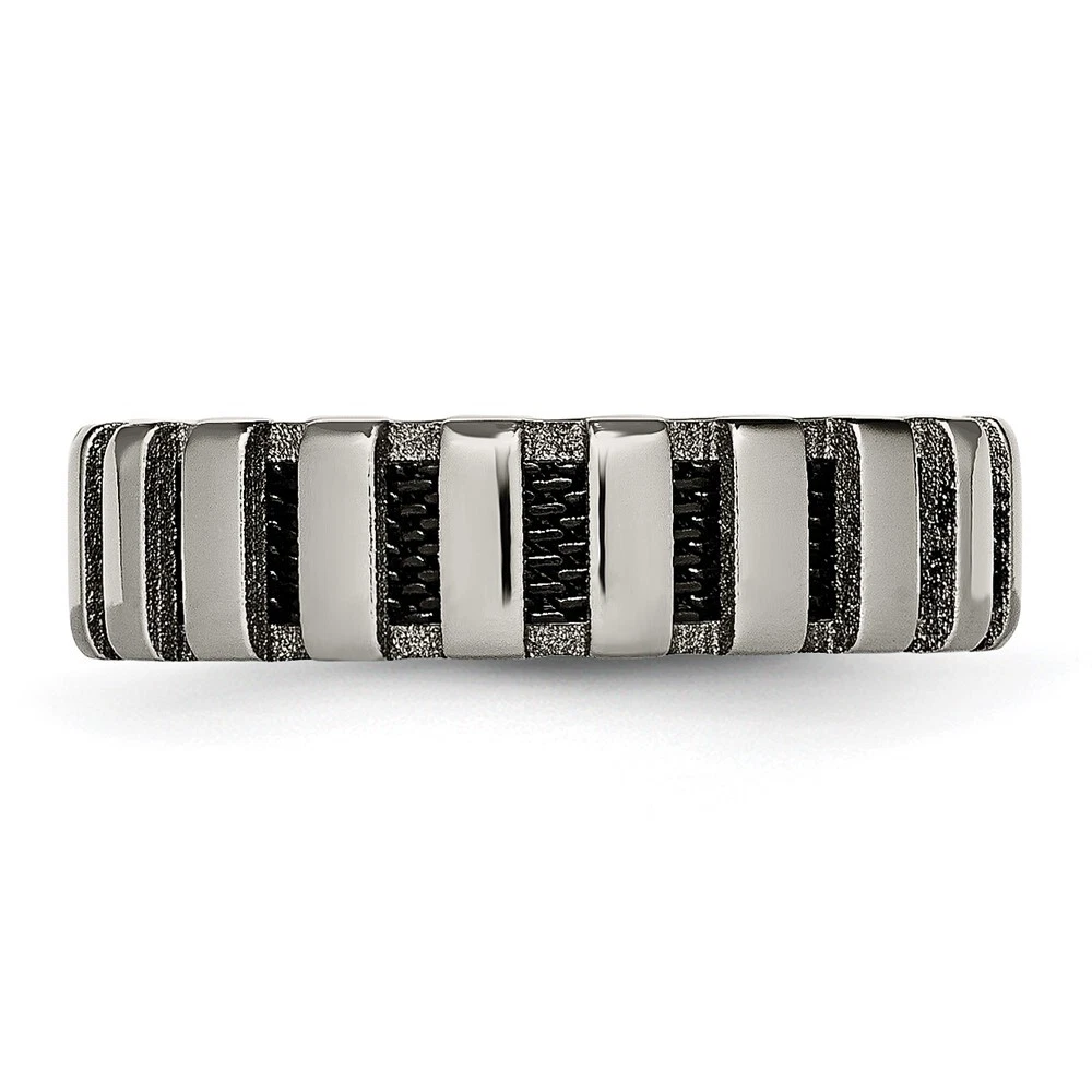 Finish:Polished|Plating:IP-Plated|Material: Accent Color 1:Black|Band Width:6 mm|Material: Primary:Titanium|Ring Fit:Standard|Sizeable:No|Thickness:< 2 mm|Item Weight U/M:gm|Width of Item:6 mm|Engravable:Yes|Packaging:Gift Pouch|Product Type:Jewelry|Jewelry Type:Rings|Sold By Unit:Each|Gender:Unisex|Material: Inlay:Wire|Material: Primary - Color:Grey|Ring Type:Wedding Bands|Edge Type:Grooved|Plating Color:Black All weights and measurements are approximate and may vary slightly from the listed information. Welcome to diamond_6720 Payments We accept all Ebay approved payment. Please sent the payment to us within 8 days after the auction has ended, or you will have unpaid case auto open by eBay. Shipping Policy We will ship all items within 1 business days of purchase during the work week (M-F) excluding holidays. If you order on Friday, your order will be shipped the following business day. Tracking will be provided when it becomes available. We will only ship to a PayPal Verified Address. Please make sure your address is current and correct. If the information does not match, your order may be canceled. Buyers are responsible for all customs, duties and taxes for your respective countries. Delivery times for International Shipping will vary. California Buyers Pay 9.0% Tax on all orders. case auto open by eBay. Return Policy & Exchange Returns or Exchange are accepted. Buyer must contact us within 30 days after the item is received. Item must be returned in unworn and resalable condition. We will only issue a refund for the purchase price, excluding any shipping fees. If we are at fault, we will provide a full refund. Buyer is responsible for all return shipping costs. BUYERS FEEDBACK If you have any concerns regarding your purchase, please contact us via eBay Message, we assure you that a satisfactory resolution will be reached. Your feedback is very important to us Do remember to give us 5 star rating(*****) if you are satisfied with our product & service .