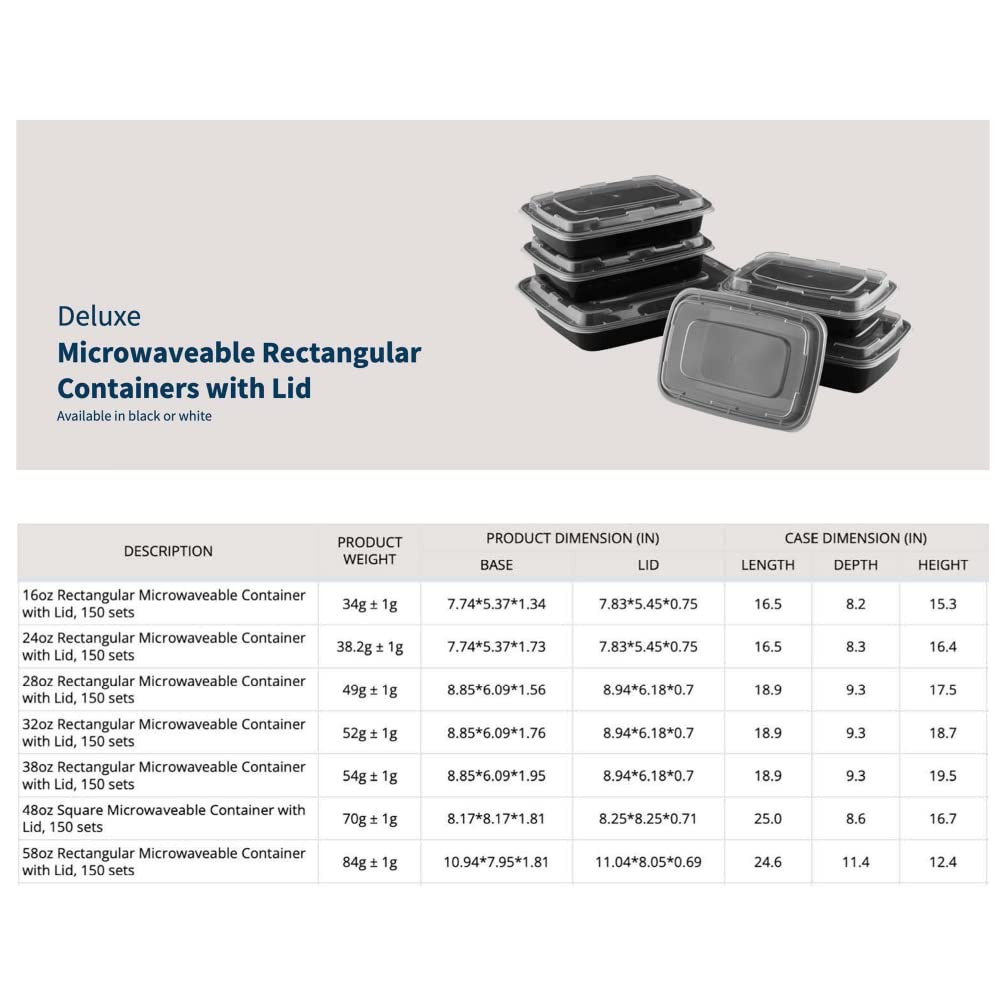 THE BEST CONTAINERS: Start using a better class of round microwavable containers with TIYA. We work directly with our own factory to create a more affordable, more versatile, and higher quality set of food storage containers with lids that perform better. LEAK-RESISTANT STORAGE: There's no need to worry about spills! In the car, refrigerator, lunch box, or freezer these rectangular containers keep leak-proof even with sauces and liquids. MORE VERSATILE: We're changing the takeout container for the better! Start using a stackable, microwave safe, freezer safe, dishwasher safe food container that's strong enough to use and reuse. Each black container is made of recyclable plastic. SPECIFICATIONS: These 38 oz containers use food grade bpa free plastic for the body and lids. Our material is oil and water resistant with no leeching or unsightly stains. These rectangular containers come in a 150 pack to give you a better deal for bulk meal prepping and restaurant to-go service. TIYA: TIYA stands for Takeout Is Your Answer, and with TIYA it really is! We're a restaurant supply store based in California right here in the USA and we're proud to serve customers across North America. When you need it made better, TIYA!