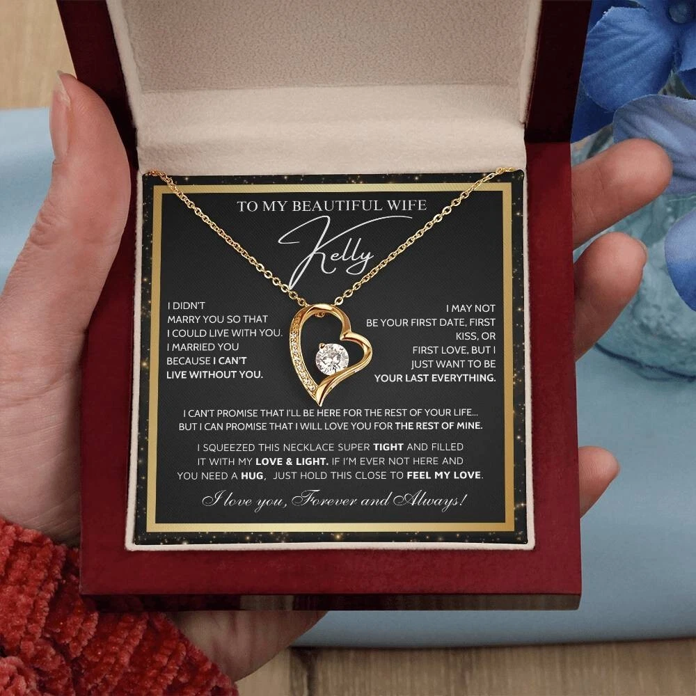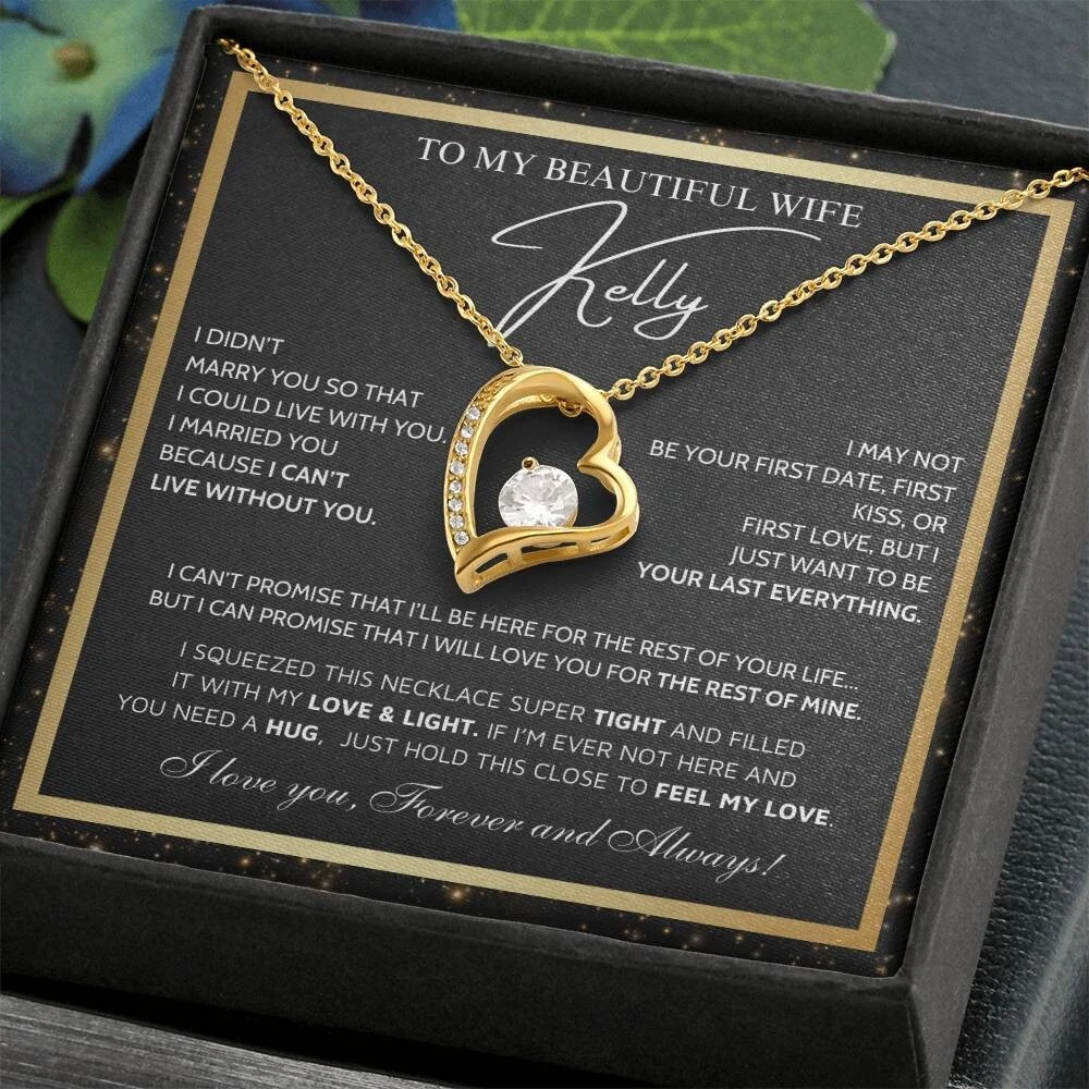 To My Beautiful Wife Necklace From Husband, Jewelry For Women, Birthday Gifts A Heartfelt Gift for Your Wife Surprise your wife with a timeless treasure she?ll cherish forever. Whether it's Christmas, her birthday, graduation, or just because, the Forever Love Necklace is the perfect way to show your love and support. Crafted with care, this elegant piece combines beauty and sentiment, creating a gift that will light up her heart. Product Highlights - A stunning Forever Love Necklace pendant made from stainless steel , featuring a sparkling centerpiece surrounded by smaller stones for added brilliance and allure. - Pendant dimensions: 15.7mm (height) x 6mm (width). - The necklace comes with an adjustable 18"-22" cable chain and a secure lobster clasp for the perfect fit. - Inspired by timeless, classic designs, this necklace offers elegance and sophistication, making it suitable for any occasion. - Crafted from premium stainless steel , including designs such as stainless steel angel necklace and stainless steel vintage necklace for women , perfect for those who appreciate refined and modern jewelry. - The Forever Love Necklace symbolizes an eternal bond, representing the deep love and connection between you and your loved one in a way that words cannot fully express. Includes a Special Message Card To my beautiful wife I didn’t marry you so that I could live with you. I married you because I can’t live without you. I may not be your first date, first kiss, or first love, but i just want to be your last everything. I can’t promise that i’ll be here for the rest of your life... but i can promise that i will love you for the rest of mine. I Squeezed This Necklace Super Tight And Filled It With My Love & Light. If I’m Ever Not Here AND You Need A Hug, Just Hold This Close To Feel My Love. I love you, Forever and Always! Upgrade to Something Extra Special Make your gift truly unforgettable with a Mahogany-Style Luxury Gift Box, a standard box necklace antique featuring a silky interior and built-in LED light to beautifully highlight the Forever Love Necklace Pendant . Whether you choose the classic standard box necklace black , the charming standard box necklace vintage , or the elegant luxury box necklace gift , each box is carefully crafted to add a touch of sophistication and love. These box designs, including luxury box necklace vintage and luxury box necklace silver , will elevate your gift to timeless beauty and style. Your gift will truly stand out and delight the recipient, showing the care and love you put into every detail. Personalization Options Want to make it even more special? Customize the message card with your own heartfelt words. Send us your request within 1 hour of placing your order. What is Included A standard black gift box or a luxury LED wood box (your choice). A beautifully designed gift message card jewelry . Fast shipping: arrives in 3-8 business days. Satisfaction Guaranteed We are committed to ensuring that your gift reflects the special bond between you and your daughter. If you have any questions or requests, please don't hesitate to reach out to us. Show your daughter how much she means to you with the stunning Forever Love Necklace Silver or other meaningful designs like the necklace for wife and her, necklace for wife anniversary gift, future wife necklace and soulmate necklace . Order now to make her day truly unforgettable. #necklaceforwifeandher #necklaceforwifeanniversarygift #futurewifenecklace #soulmatenecklace #foreverlovenecklacesilver #foreverlovenecklaceyou #foreverlovenecklacevintage #foreverlovenecklacependant