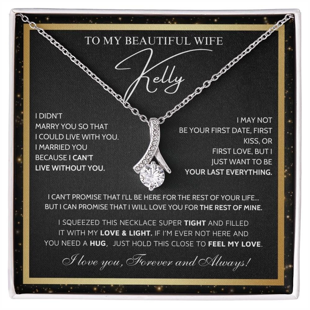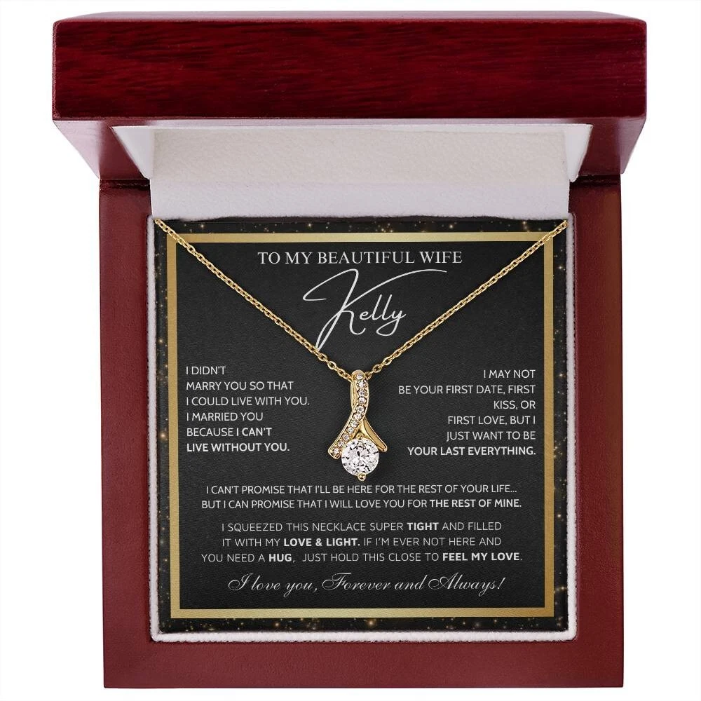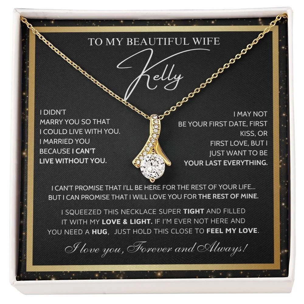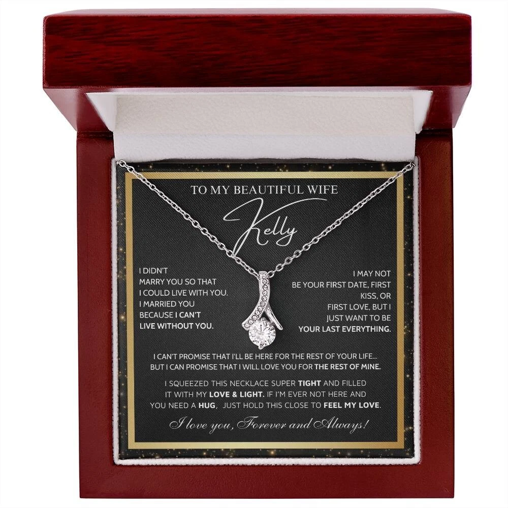To My Beautiful Wife Necklace From Husband, Jewelry For Women, Birthday Gifts A Heartfelt Gift for Your Wife Surprise your wife with a timeless treasure she’ll cherish forever. Whether it's Christmas, her birthday, graduation, or just because, the Alluring Beauty Necklace is the perfect way to show your love and support. Crafted with care, this elegant piece combines beauty and sentiment, creating a gift that will light up her heart. Product Highlights A stunning Alluring Beauty Necklace pendant made from stainless steel, featuring a sparkling centerpiece surrounded by smaller stones for added brilliance and allure. Pendant dimensions: 15.7mm (height) x 6mm (width). The necklace comes with an adjustable 18"-22" cable chain and a secure lobster clasp for the perfect fit. Inspired by timeless, classic designs, this necklace offers elegance and sophistication, making it suitable for any occasion. Crafted from premium stainless steel, including designs such as stainless steel angel necklace and stainless steel vintage necklace for women , perfect for those who appreciate refined and modern jewelry. The Alluring Beauty Necklace symbolizes an eternal bond, representing the deep love and connection between you and your loved one in a way that words cannot fully express. Includes a Special Message Card To my beautiful wife I didn’t marry you so that I could live with you. I married you because I can’t live without you. I may not be your first date, first kiss, or first love, but i just want to be your last everything. I can’t promise that i’ll be here for the rest of your life... but i can promise that i will love you for the rest of mine. I Squeezed This Necklace Super Tight And Filled It With My Love & Light. If I’m Ever Not Here AND You Need A Hug, Just Hold This Close To Feel My Love. I love you, Forever and Always! Upgrade to Something Extra Special Make your gift truly unforgettable with a Mahogany-Style Luxury Gift Box , a standard box necklace antique featuring a silky interior and built-in LED light to beautifully highlight the Alluring Beauty Necklace Pendant. Whether you choose the classic standard box necklace black , the charming standard box necklace vintage , or the elegant luxury box necklace gift , each box is carefully crafted to add a touch of sophistication and love. These box designs, including luxury box necklace vintage and luxury box necklace silver , will elevate your gift to timeless beauty and style. Your gift will truly stand out and delight the recipient, showing the care and love you put into every detail. Personalization Options Want to make it even more special? Customize the message card with your own heartfelt words. Send us your request within 1 hour of placing your order. What is Included A standard black gift box or a luxury LED wood box (your choice). A beautifully designed gift message card jewelry. Fast shipping: arrives in 3-8 business days. Satisfaction Guaranteed We are committed to ensuring that your gift reflects the special bond between you and your loved one. If you have any questions or requests, please don't hesitate to reach out to us. Show your wife how much she means to you with the stunning Alluring Beauty Necklace Silver or other meaningful designs like the necklace for wife and her , necklace for wife anniversary gift , future wife necklace , and soulmate necklace . Order now to make her day truly unforgettable. #necklaceforwifeandher #necklaceforwifeanniversarygift #futurewifenecklace #soulmatenecklace #alluringbeautynecklacesilver #alluringbeautynecklaceyou #alluringbeautynecklacevintage #alluringbeautynecklacependant
