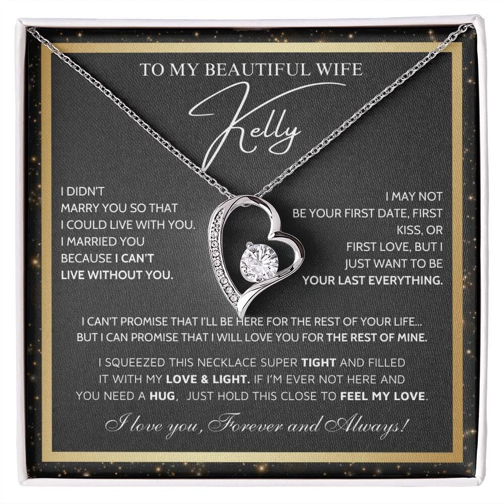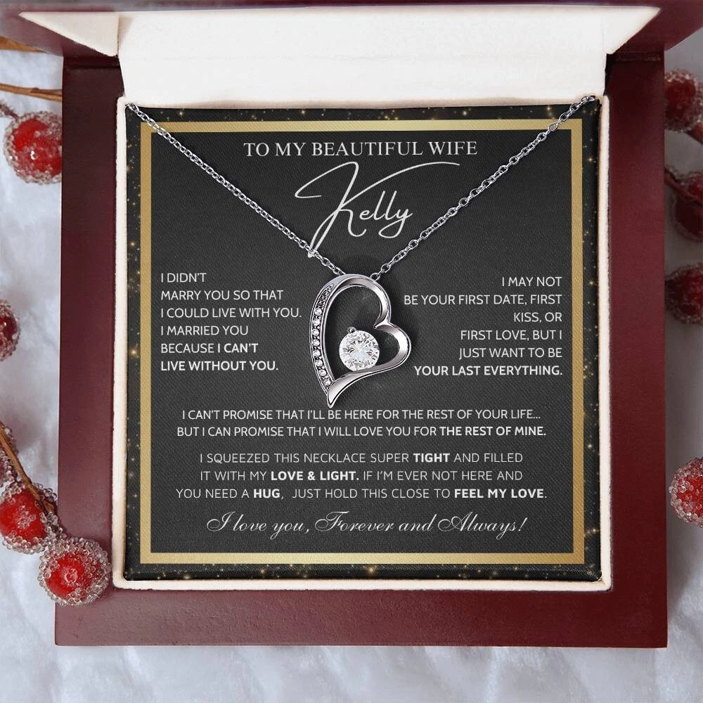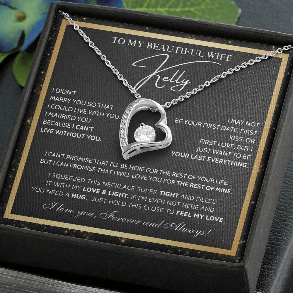To My Beautiful Wife Necklace From Husband, Jewelry For Women, Birthday Gifts A Heartfelt Gift for Your Wife: Surprise your wife with a timeless treasure she?ll cherish forever. Whether it's Christmas, her birthday, graduation, or just because, the Forever Love Necklace is the perfect way to show your love and support. Crafted with care, this elegant piece combines beauty and sentiment, creating a gift that will light up her heart. Product Highlights: - A stunning Forever Love Necklace pendant made from stainless steel , featuring a sparkling centerpiece surrounded by smaller stones for added brilliance and allure. - Pendant dimensions: 15.7mm (height) x 6mm (width). - The necklace comes with an adjustable 18"-22" cable chain and a secure lobster clasp for the perfect fit. - Inspired by timeless, classic designs, this necklace offers elegance and sophistication, making it suitable for any occasion. - Crafted from premium stainless steel , including designs such as stainless steel angel necklace and stainless steel vintage necklace for women , perfect for those who appreciate refined and modern jewelry. - The Forever Love Necklace symbolizes an eternal bond, representing the deep love and connection between you and your loved one in a way that words cannot fully express. Includes a Special Message Card To My Daughter Wherever your journey in life may take you. I pray you will always be safe Enjoy the ride and never forget your way back home. I can't promise to be here for the rest of your life. But I can promise to love you for the rest of mine. You are my sunshine You will always be my baby girl I love you forever and always Love, Dad Upgrade to Something Extra Special: Make your gift truly unforgettable with a Mahogany-Style Luxury Gift Box, a standard box necklace antique featuring a silky interior and built-in LED light to beautifully highlight the Forever Love Necklace Pendant . Whether you choose the classic standard box necklace black , the charming standard box necklace vintage , or the elegant luxury box necklace gift , each box is carefully crafted to add a touch of sophistication and love. These box designs, including luxury box necklace vintage and luxury box necklace silver , will elevate your gift to timeless beauty and style. Your gift will truly stand out and delight the recipient, showing the care and love you put into every detail. Personalization Options: Want to make it even more special? Customize the message card with your own heartfelt words. Send us your request within 1 hour of placing your order. What is Included: A standard black gift box or a luxury LED wood box (your choice). A beautifully designed gift message card jewelry . Fast shipping: arrives in 3-8 business days. Satisfaction Guaranteed: We are committed to ensuring that your gift reflects the special bond between you and your daughter. If you have any questions or requests, please don't hesitate to reach out to us. Show your daughter how much she means to you with the stunning Forever Love Necklace Silver or other meaningful designs like the necklace for wife and her, necklace for wife anniversary gift, future wife necklace and soulmate necklace . Order now to make her day truly unforgettable. #necklaceforwifeandher #necklaceforwifeanniversarygift #futurewifenecklace #soulmatenecklace #foreverlovenecklacesilver #foreverlovenecklaceyou #foreverlovenecklacevintage #foreverlovenecklacependant