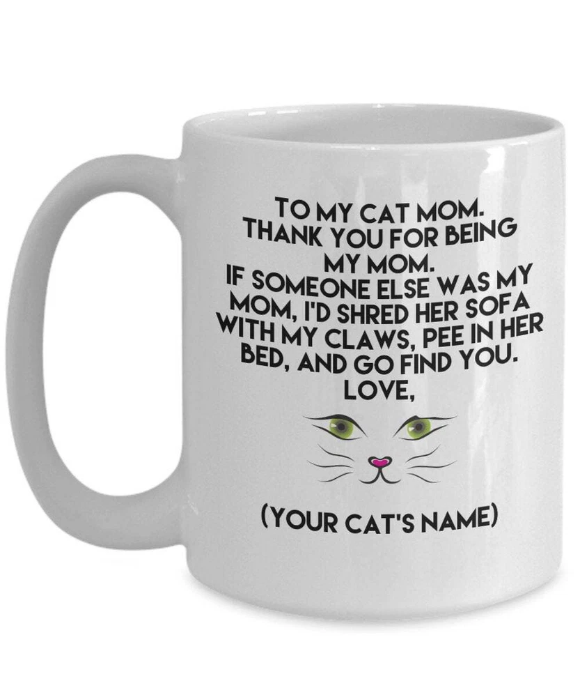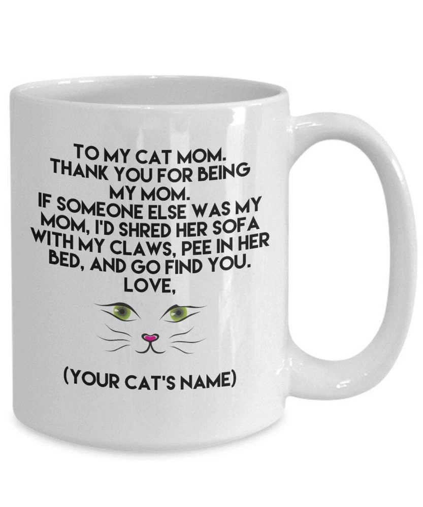 To My Cat Mom Custom Mug Gift For Women Mug For Coworker Gifts For Cat Lover Product Details.. This high quality 11oz. ceramic white mug has a premium hard coat that provides crisp and vibrant color reproduction sure to last for years. Perfect for all hot & cold beverages. The highest quality printing possible is used. It will never fade no matter how many times you wash it. Material: 100% Ceramic. Print both sides. Dishwasher and Microwave Safe. High Gloss + Premium White Finish. Printed in the U.S.A. Personalized & Custom. We support personalized and custom mug to add custom, when placing an order, you can add notes to the "order note" in shipping address section. Also you can contact us directly via message. Shipping Info. Ready to ship in 1 to 2 business days, All products are made-to-order and proudly printed in the United States. Shipped by USPS and DHL, You will receive your order in 5-7 days. Replace & Refund. All products are defective during shipping broken, chipped will be replaced free of charge. You are not satisfied with the product, we will refund 100% money to you. If any other issues arise, please do not hesitate to message, we would be more than happy to assist you.