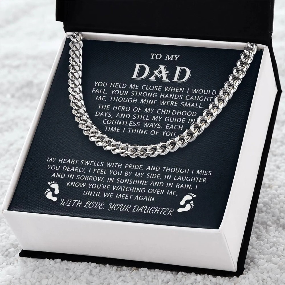 Dad Necklace Gifts, Birthday Gifts, XMas Day Gifts for Dad from Daughter. esigned by FetchTheLove Materials: Stainless steel Gemstone: Cubic zirconia Pendant width: 0.4 Inches; Pendant height: 0.8 Inches; Necklace length: 22 Inches Made to Order Express your love with the Alluring Beauty Necklace – a meaningful heart pendant with a touching message for your daughter. A timeless gift for birthdays or Christmas! Imagine her reaction when she opens this stunning gift! The Alluring Beauty necklace features a petite ribbon shaped pendant that is sure to dazzle your special someone. Whether it's a birthday or anniversary, make sure to get her a gift she will love for years to come. 14k white gold finish or 18k yellow gold finish over stainless steel 7mm cubic zirconia Pendant dimensions: 0.8" (20mm) height / 0.4" (10mm) width Adjustable length: 18" - 22" (45.72 cm - 55.88 cm) Lobster clasp Your piece is lovingly packaged in a complimentary soft touch box for easy gifting. Elevate your presentation by upgrading to the mahogany style luxury box, which features a brilliant LED spotlight