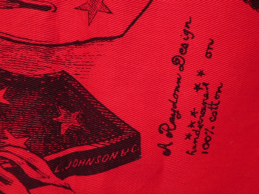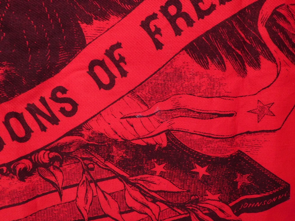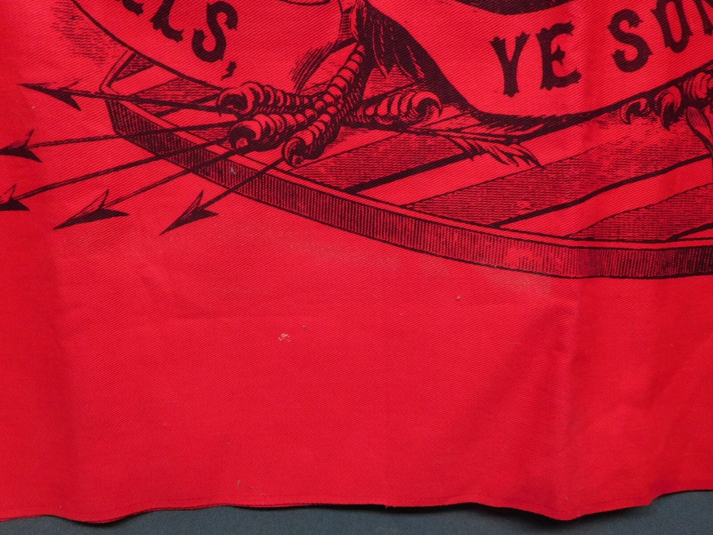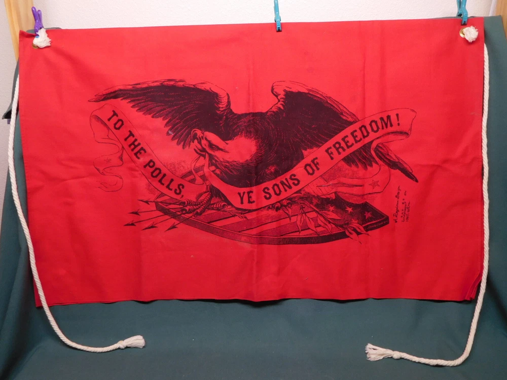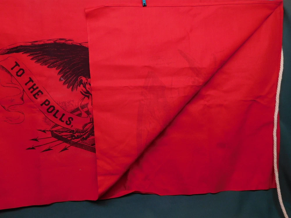 To The Polls Ye Sons Of Freedom banner. Measures 34 1/2 x 21". Double layer of cloth, folded at the top. Printed on one side only. Design by L. Johnson. Printed by A Raydonn. It is not perfect. There are some spots of color and some soiling from storage and being folded.