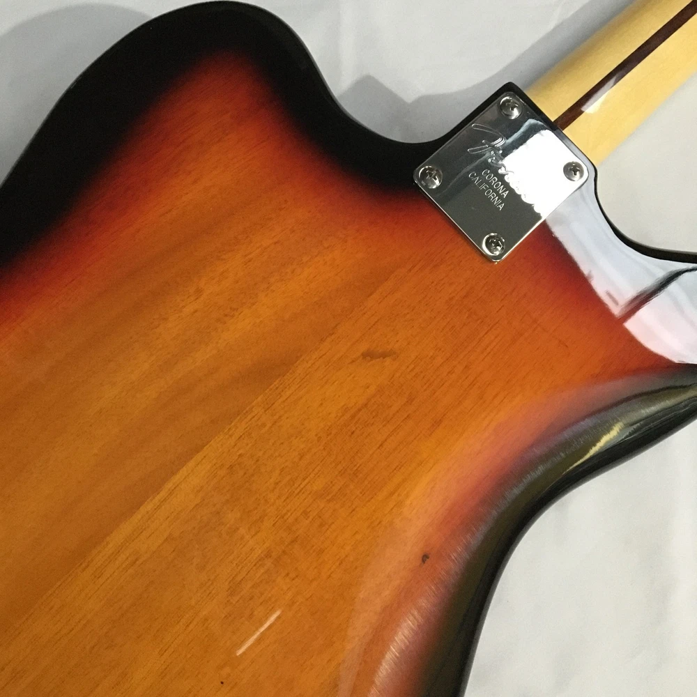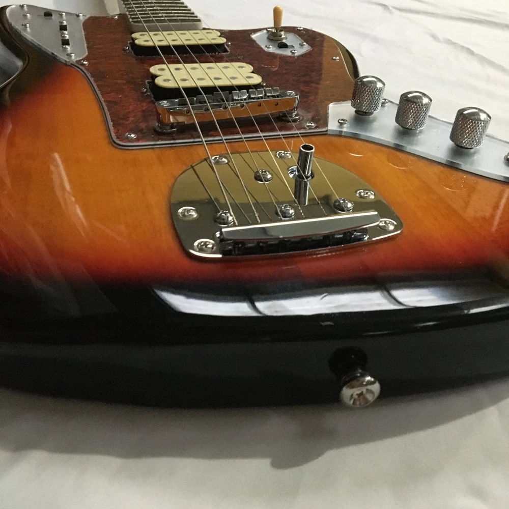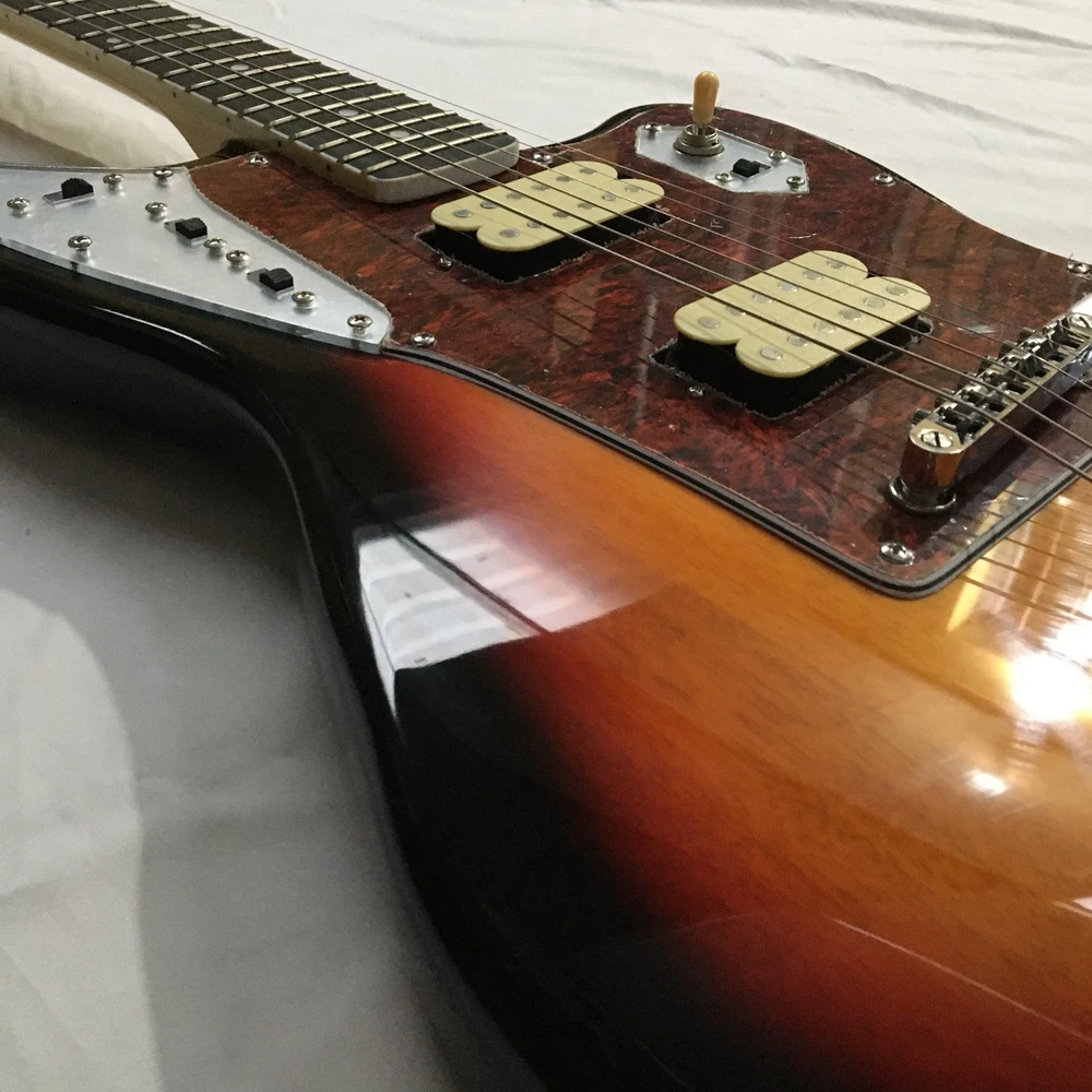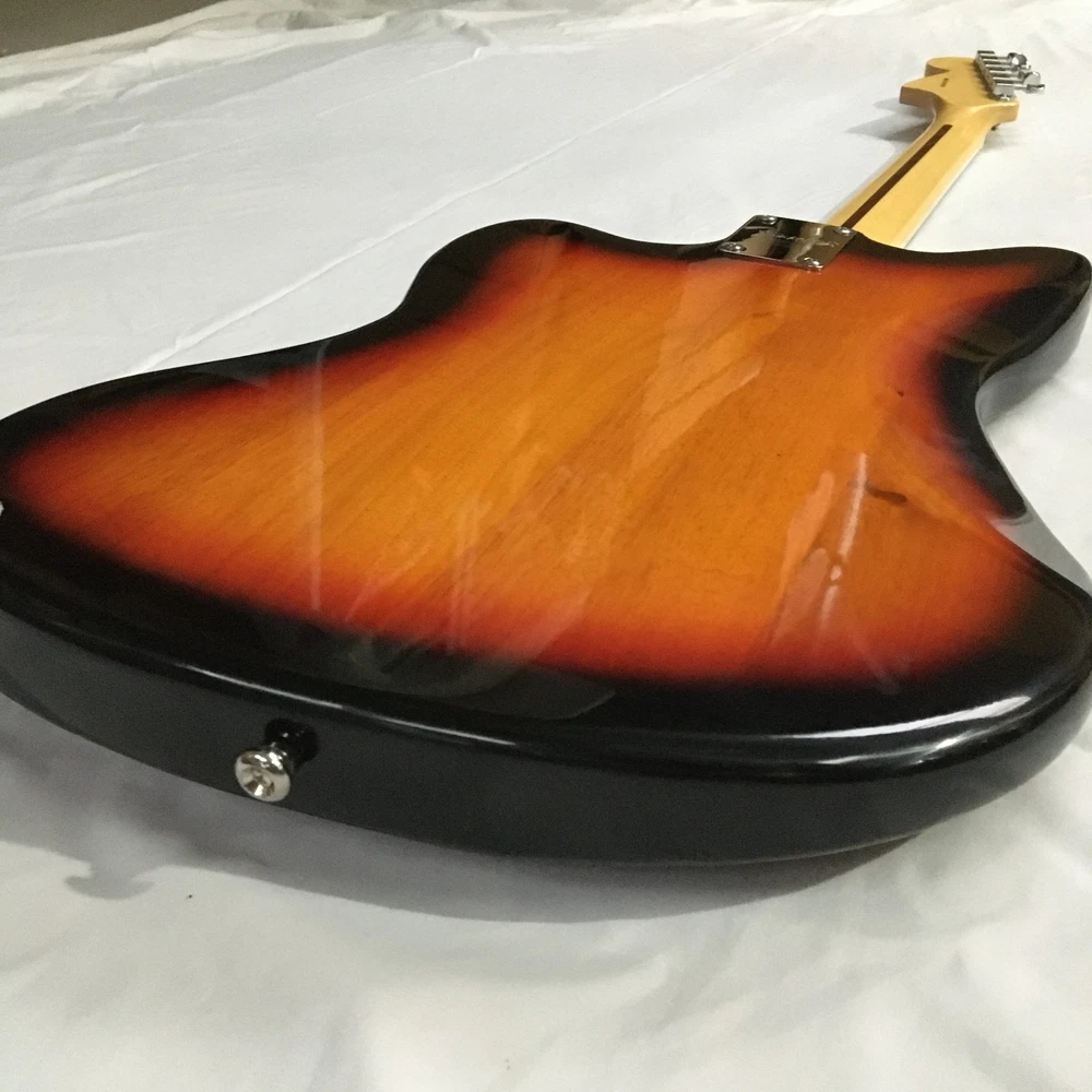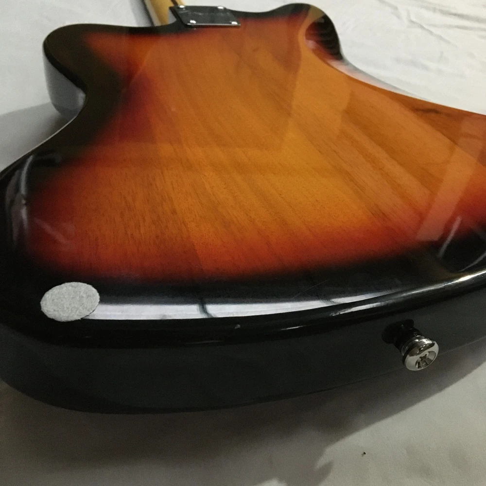 This is a Tobacco Jazzmaster Electric Guitar with a solid Mahogany body, Maple neck, and Rosewood fretboard. It has a 6-string configuration, 22 frets, and HH pickup configuration. The guitar features chrome hardware and includes a cable. It is a custom model from the Standard series, designed for professional-level performance in 2024. The unit is personalized with an OEM logo. Made in China, it complies with California Prop 65 regulations.